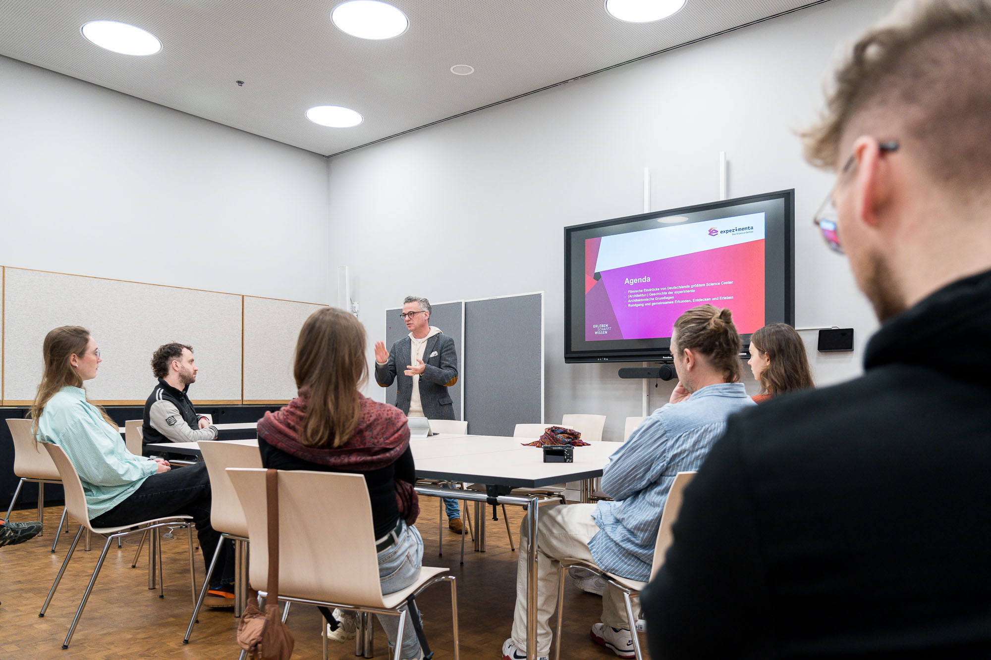 Der Startschuss fiel mit einer faszinierenden Architekturführung durch die experimenta – Das Science Center in Heilbronn. Umgeben von der inspirierenden Kulisse, geführt von Jan C. Bodenbender, erfuhren wir spannende Details über das Konzept und die Entstehung dieses außergewöhnlichen Gebäudes. Anschließend hatten wir die Gelegenheit, in den interaktiven Erlebniswelten des Science Centers mit vollem Körpereinsatz uns selbst auszuprobieren – voller Forschergeist und mit jeder Menge Spaß. Kreativer Tatendrang pur!