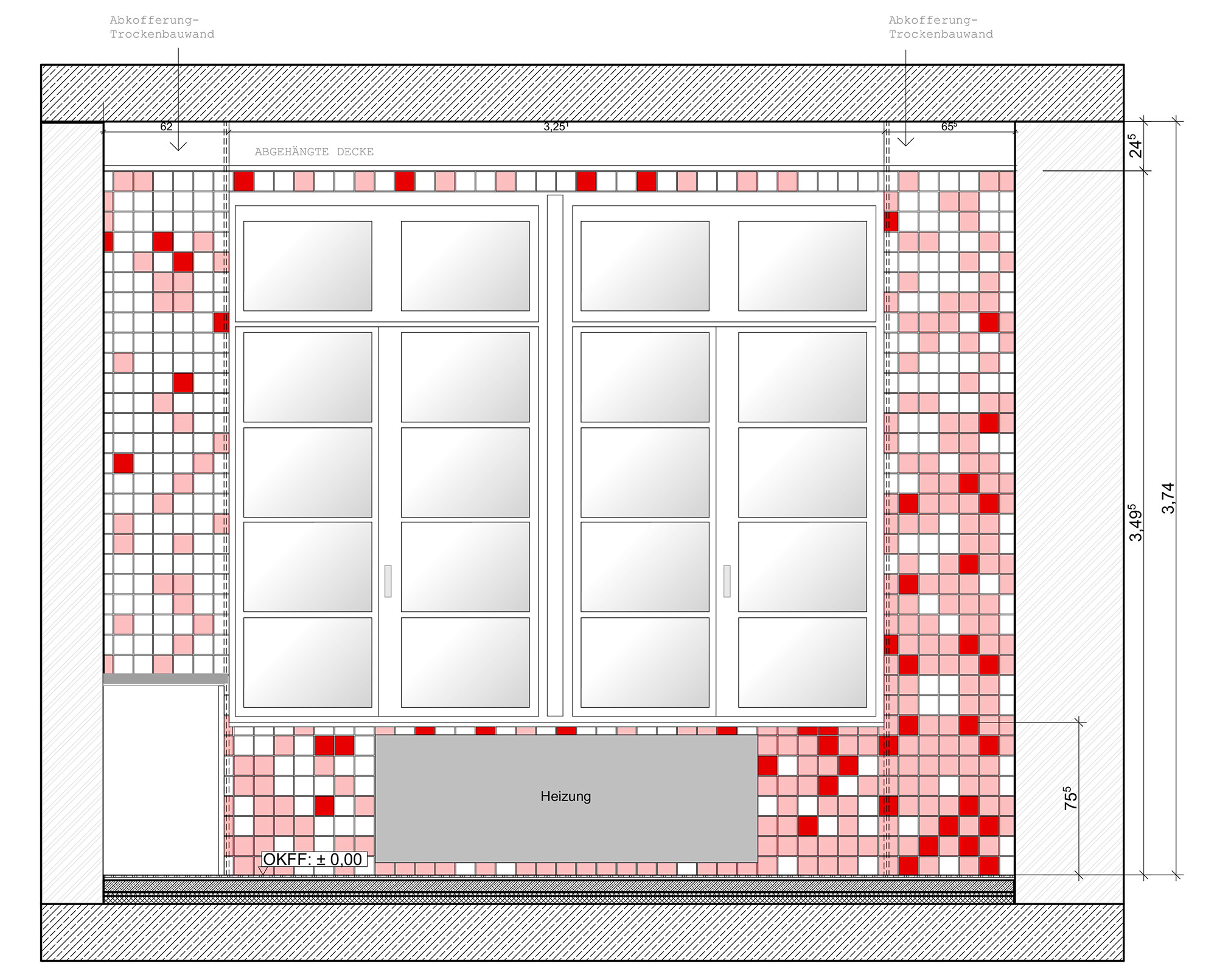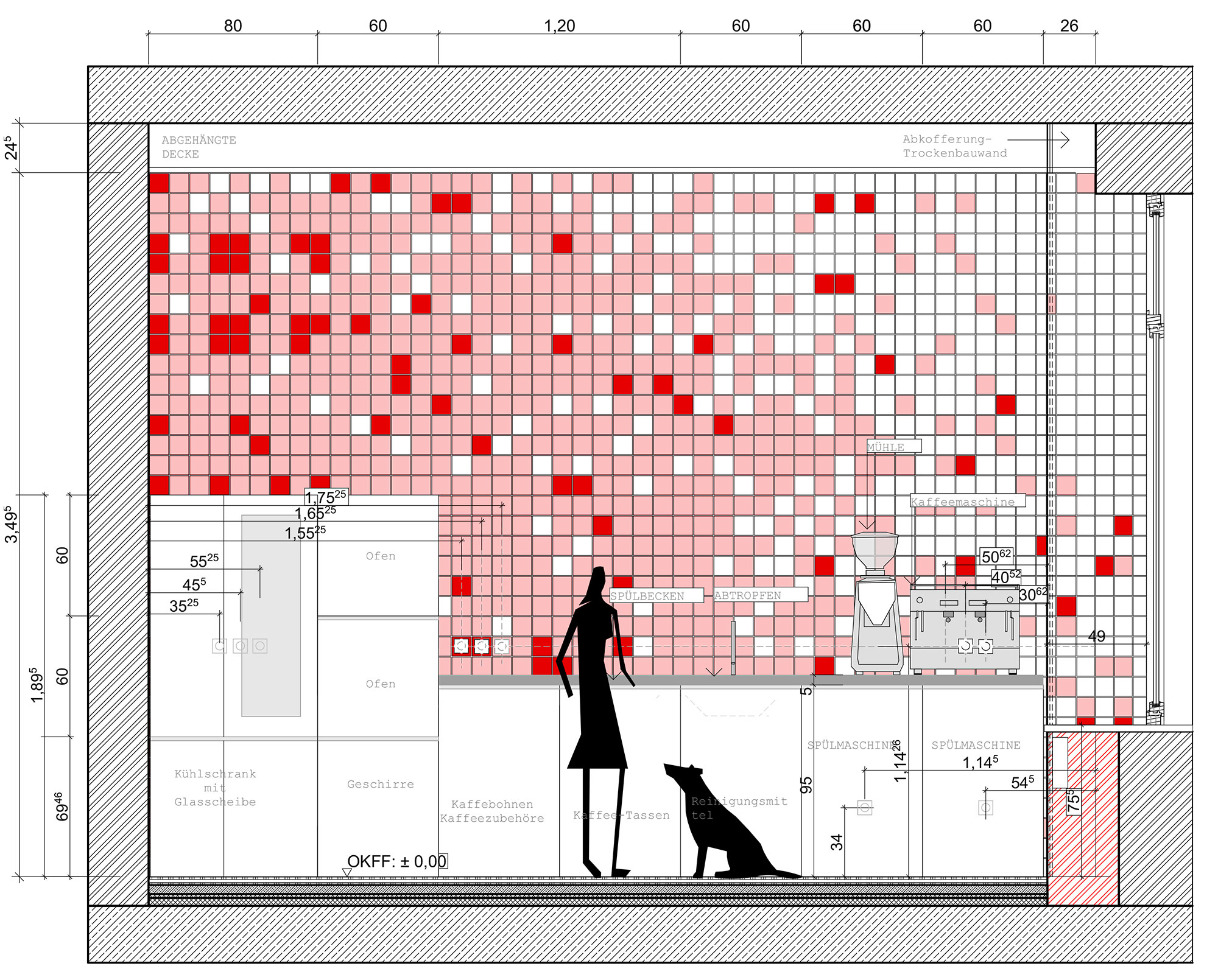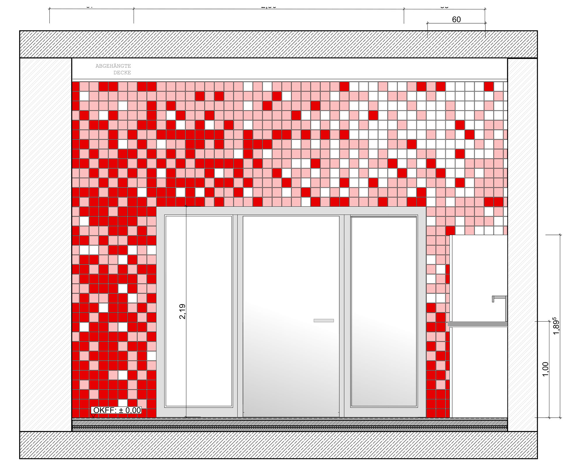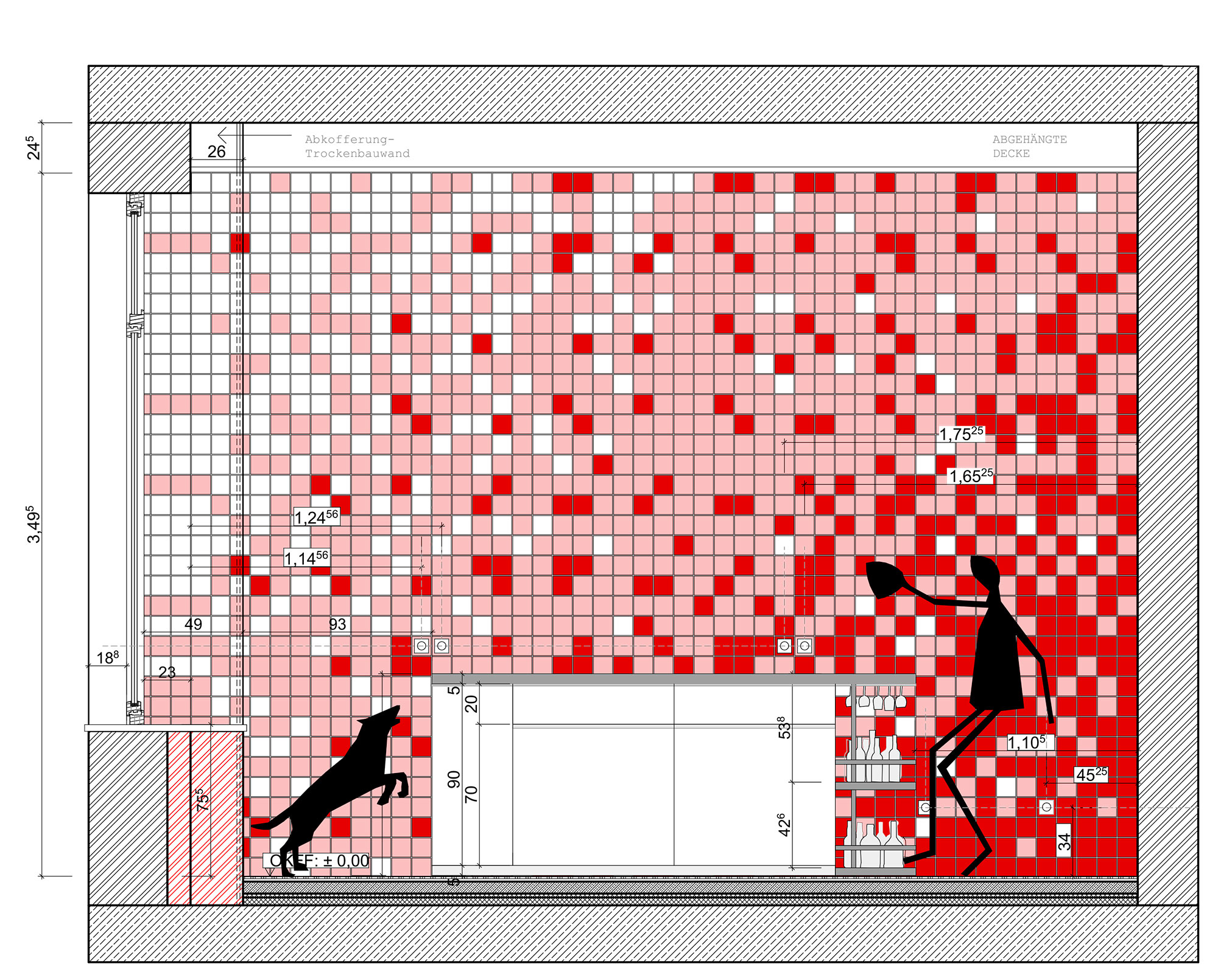 Der ehemals rein funktionalen, nüchternen Industrieküche wird mit einem ungewöhnlichen Fliesenspiegel neues Leben eingehaucht: Wir haben einen Pixelverlauf entworfen, der sich vom Boden über die gesamten Wände erstreckt und dabei unsere Unternehmensfarben, von Weiß bis Rot bei den Fliesen und Schwarz bei den Fugen umfasst. Dieser Helligkeitsverlauf, der sich hell vom Fenster bis rot in die gegenüberliegende Raumecke erstreckt, unterstützt die Tiefenwirkung des Raumes und erinnert dabei etwas an TETRIS.