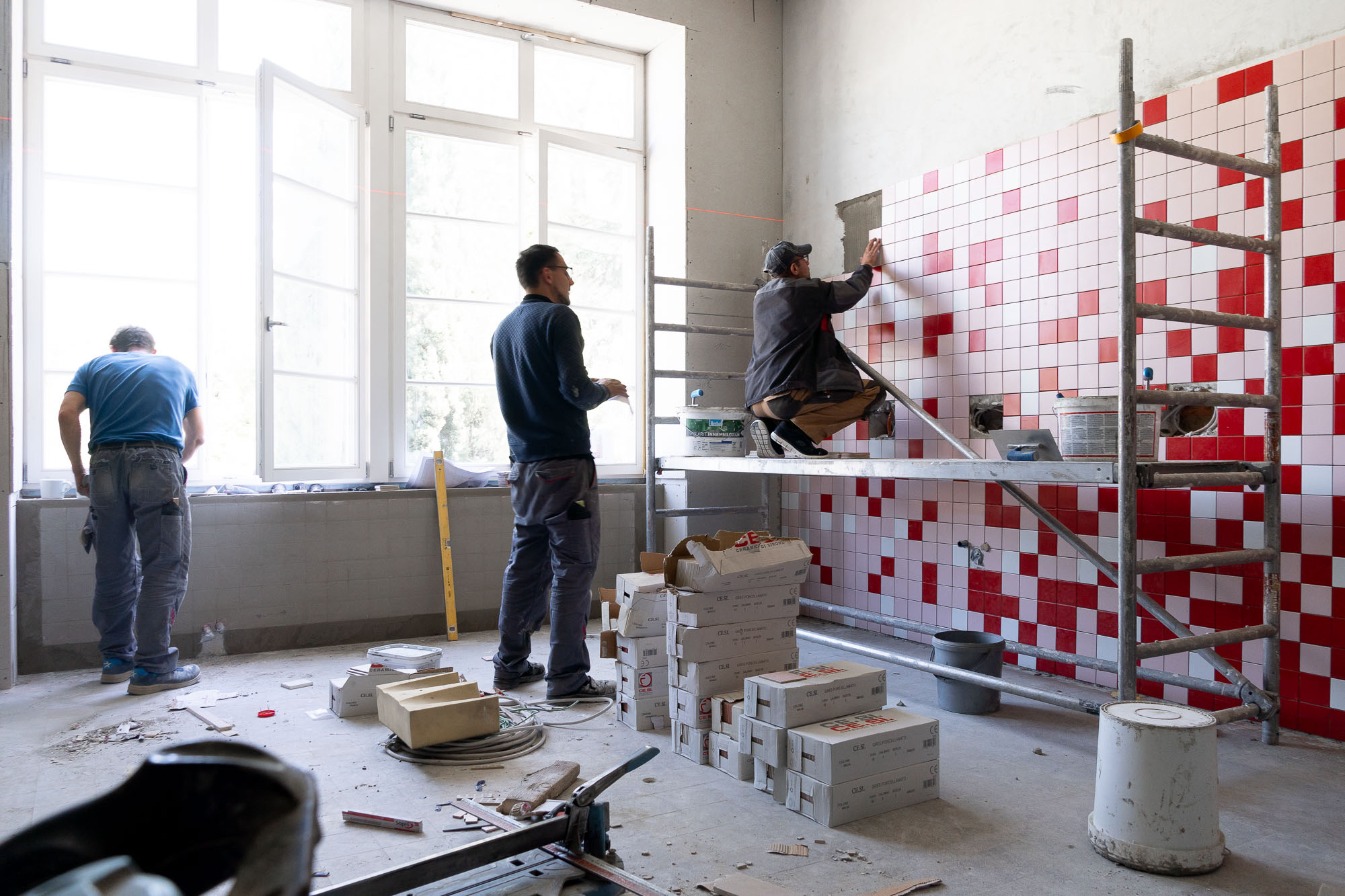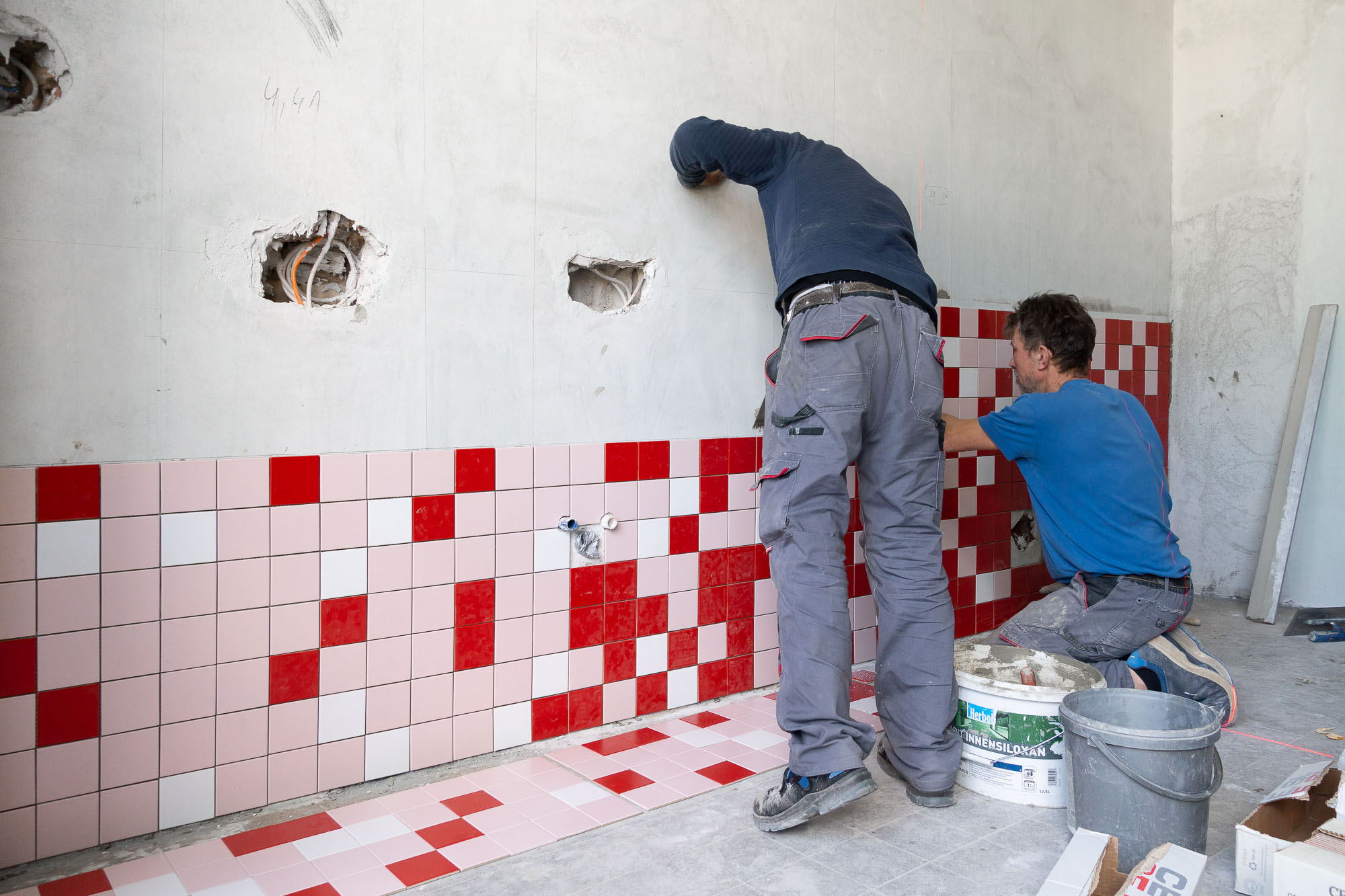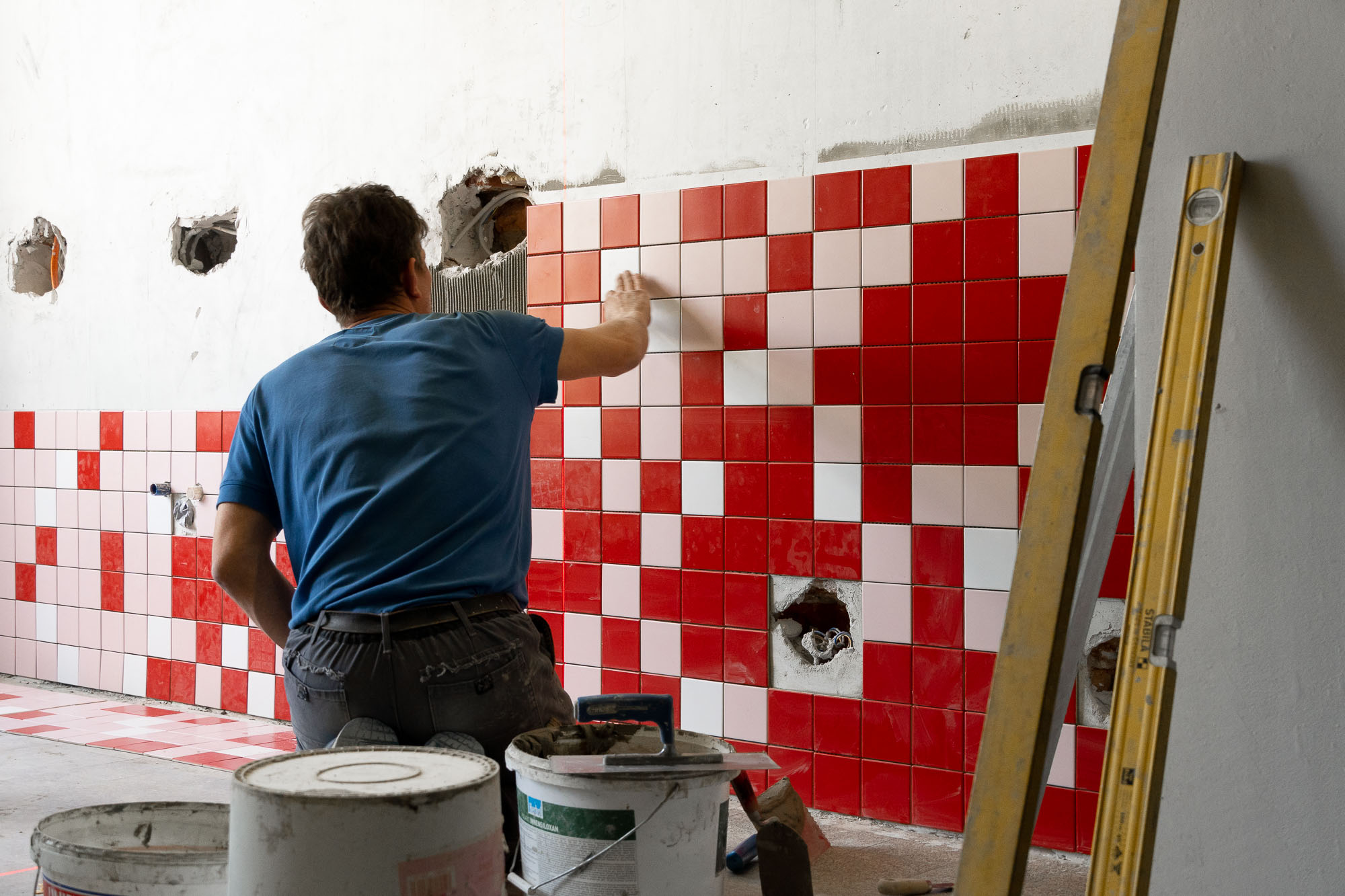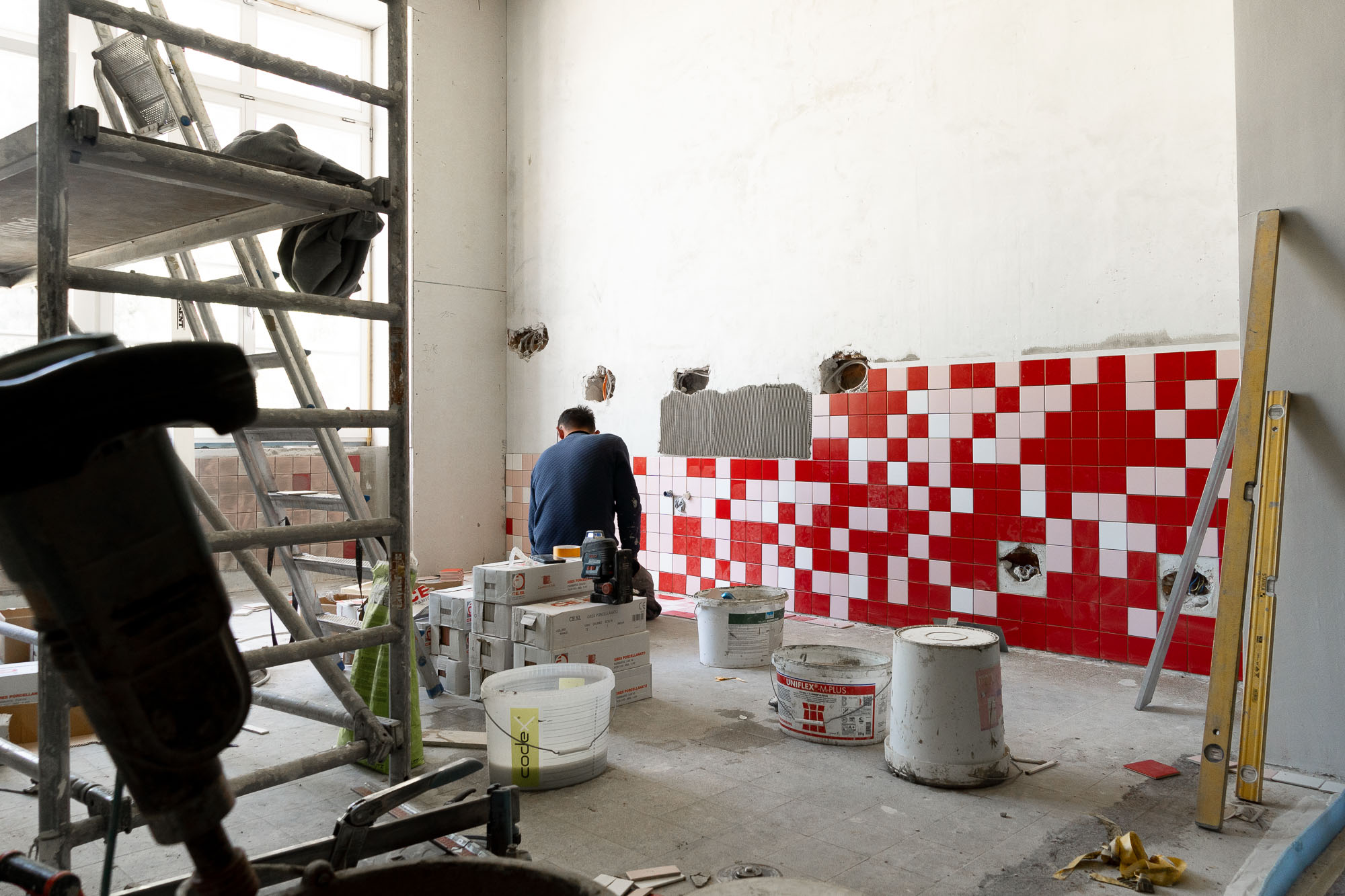 Der ehemals rein funktionalen, nüchternen Industrieküche wird mit einem ungewöhnlichen Fliesenspiegel neues Leben eingehaucht: Wir haben einen Pixelverlauf entworfen, der sich vom Boden über die gesamten Wände erstreckt und dabei unsere Unternehmensfarben, von Weiß bis Rot bei den Fliesen und Schwarz bei den Fugen umfasst. Dieser Helligkeitsverlauf, der sich hell vom Fenster bis rot in die gegenüberliegende Raumecke erstreckt, unterstützt die Tiefenwirkung des Raumes und erinnert dabei etwas an TETRIS.