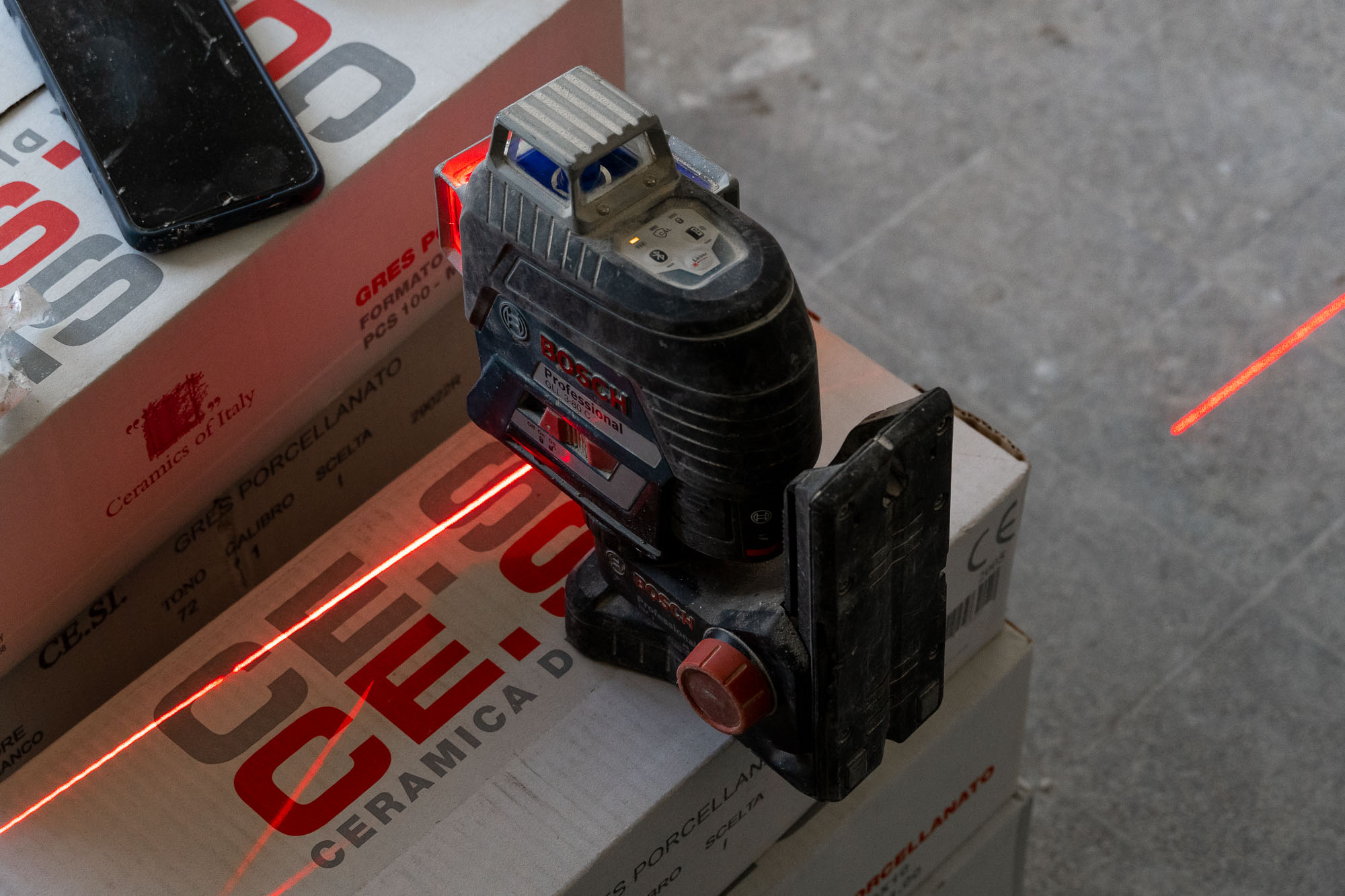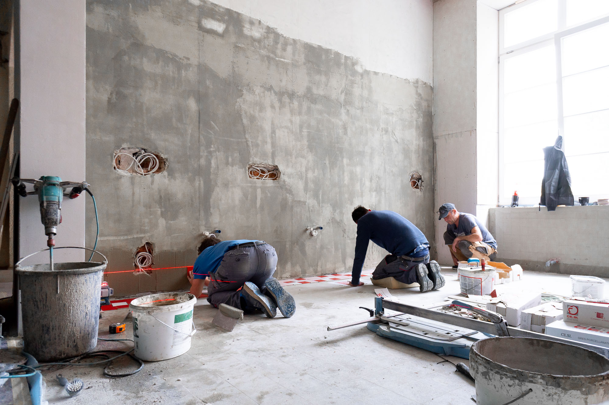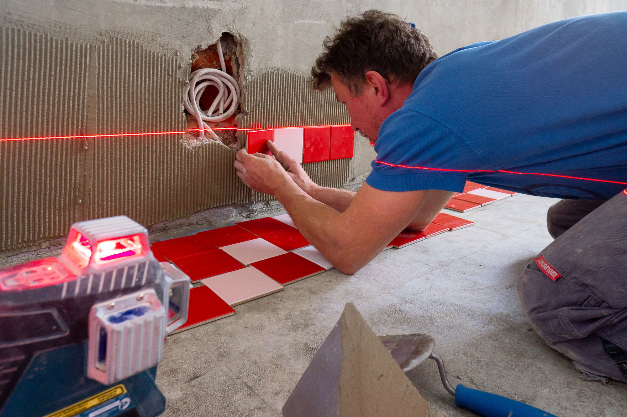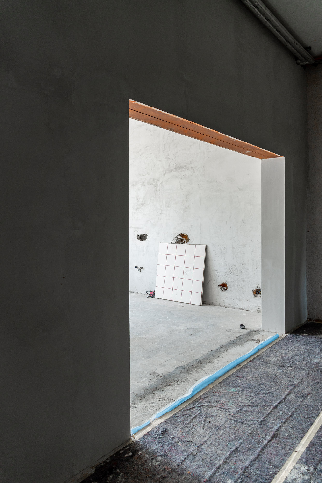 Der ehemals rein funktionalen, nüchternen Industrieküche wird mit einem ungewöhnlichen Fliesenspiegel neues Leben eingehaucht: Wir haben einen Pixelverlauf entworfen, der sich vom Boden über die gesamten Wände erstreckt und dabei unsere Unternehmensfarben, von Weiß bis Rot bei den Fliesen und Schwarz bei den Fugen umfasst. Dieser Helligkeitsverlauf, der sich hell vom Fenster bis rot in die gegenüberliegende Raumecke erstreckt, unterstützt die Tiefenwirkung des Raumes und erinnert dabei etwas an TETRIS.
