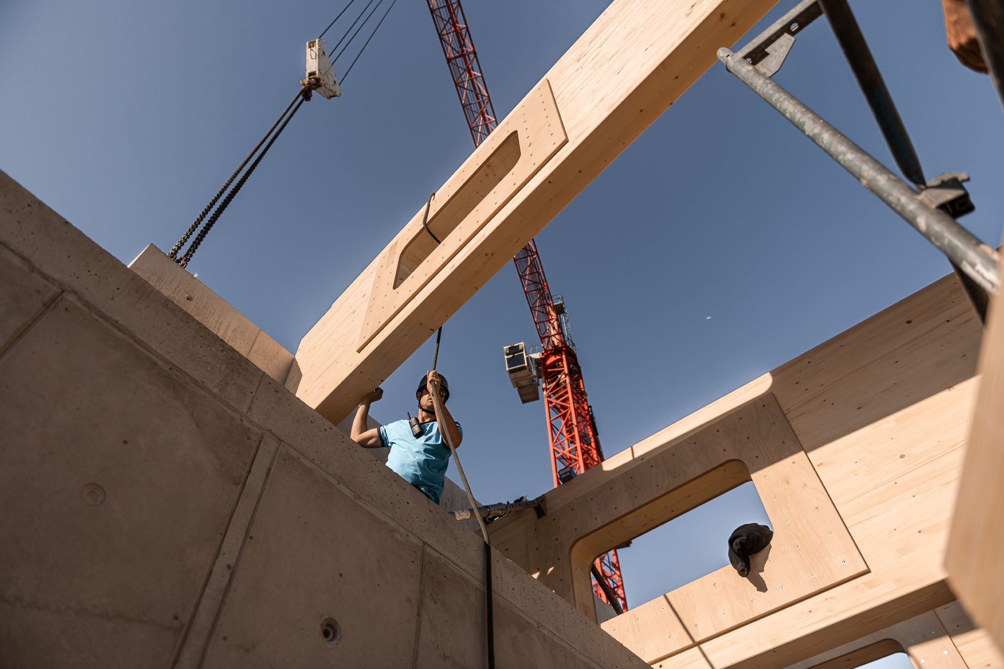 Nach der erfolgreichen Schwertransportlieferung der 21 Holzbinder mit je 40 Meter Länge stehen für die kommenden Tage noch weitere beeindruckenden Ereignisse an. Um die weiteren ausladenden und schweren Holzteile bewegen zu können, musste ein spezieller Lastenkran an der Baustelle positioniert und mit zusätzlichen Gewichten versehen werden. Dieser ermöglicht jeweils für die beiden Bauabschnitte der Sport- und der Kulturhalle innerhalb weniger Tagen die gesamte vorgeplante Dachkonstruktion von 4100 m² an Ort und Stelle zu montiert.