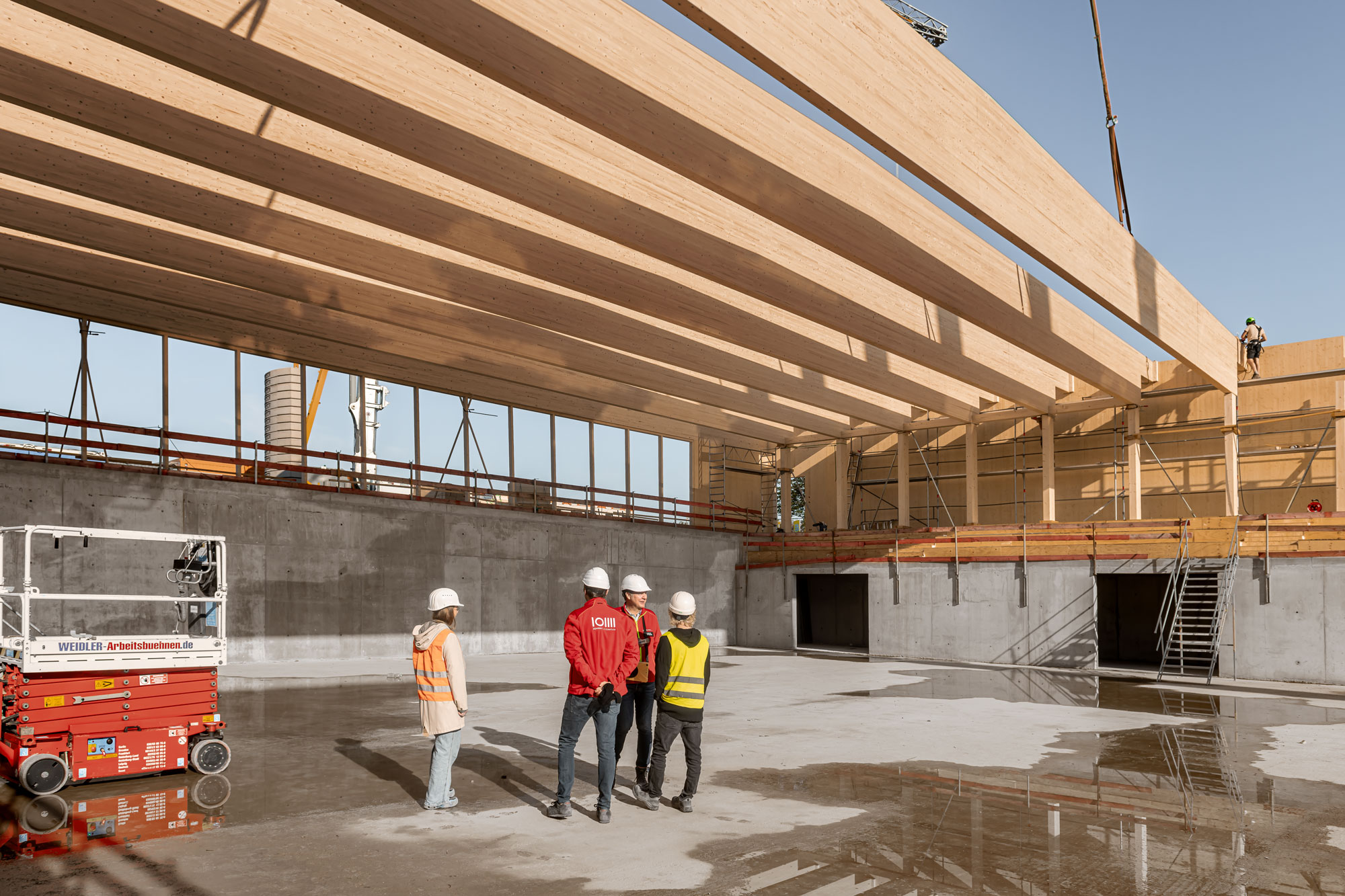 In Kooperation mit Dietrich | Untertrifaller Architekten führt JOHNNY aktuell das Baumanagement in der ersten Bauphase für das „Kultur- und Sportquartier“ in Plankstadt aus. Seit März wurde bereits die 4000 m² große Bodenplatte gegossen, unter der vollflächig ein Registermattensystem für die Beheizung des Gebäudes mittels Geothermie verlegt wurde, mit 34.500 m Anschlussleitungen. Weiterhin wurde in Stahl-Betonbauweise der unter Geländeniveau angeordnete Bereich der Sporthalle, die Treppenaufgänge und auch die zwischen Sporthalle und Kulturhalle erforderliche Brandwand im Erdgeschoss fertiggestellt. Alle weiteren oberirdischen Bauteile werden komplett in einer Holzkonstruktion erstellt.
