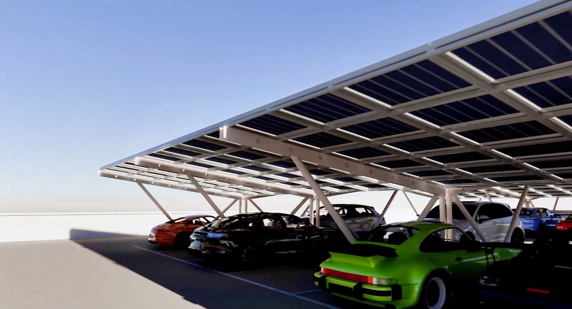 Das auf flächeneffizient optimierte, doppelstöckige Gebäude hat ca. 60 Parkplätze auf dem Dach, erreichbar über eine Rampe, die im Osten und Norden um das Gebäude führt. Die Stellflächen werden vollflächig mit einer PV-Anlage überbaut. So wird ein Großteil des Stromverbrauchs direkt am Gebäude gewonnen und die exklusiven Fahrzeuge vor der Witterung und Sonne geschützt.