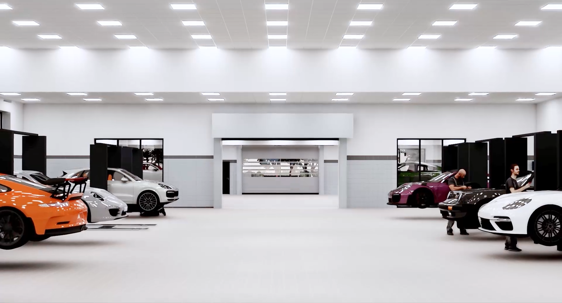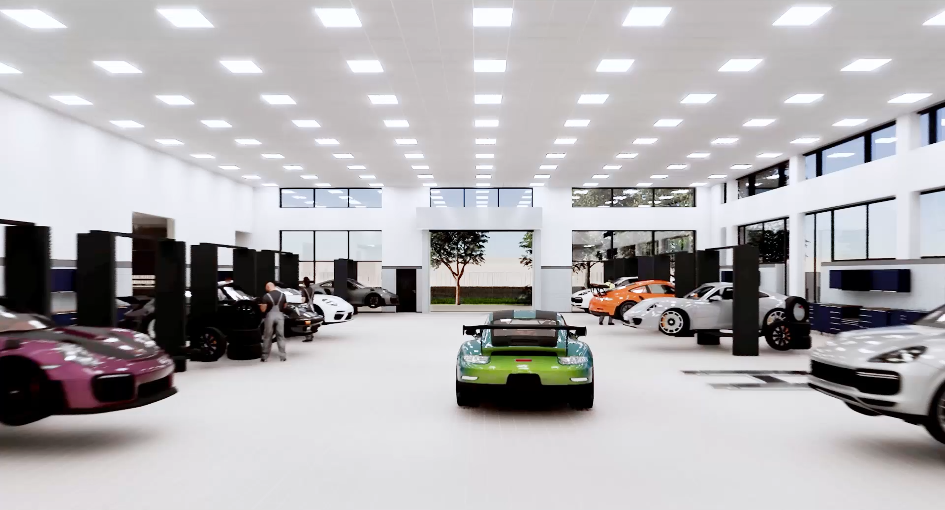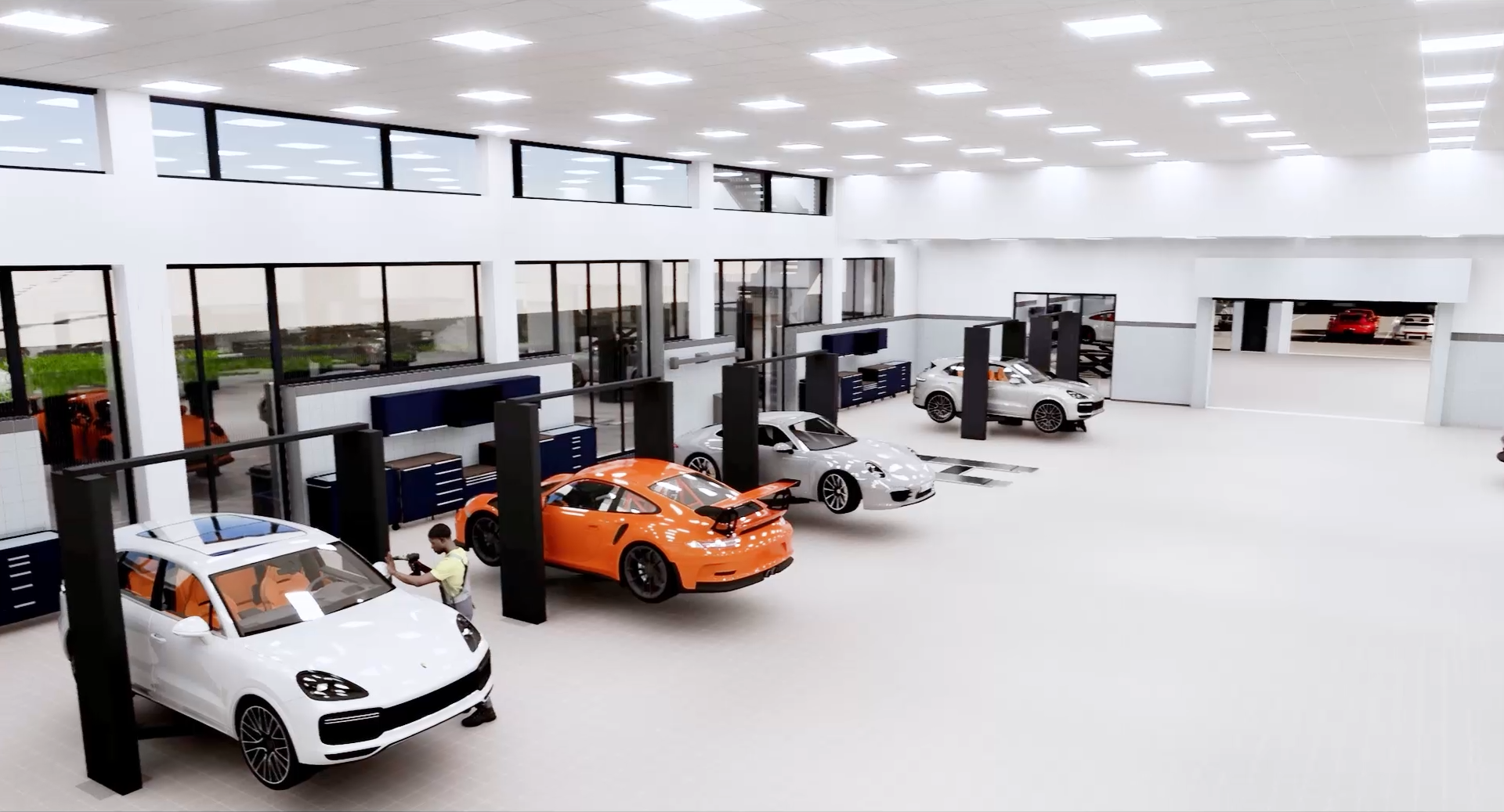 Im Erdgeschoss des Gebäudes befinden sich neben verschiedenen Lagern und Bürobereichen der große mechanische und elektrische Werkstattbereich und ein kleinerer Werkstattbereich für kosmetische Reparaturen. Insgesamt 20 Werkstattbuchten und zwei Lackierkabinen werden realisiert. Zudem ist hier der Bereich für Hochspannungsarbeiten und ein Batterieraum verortet. Zwei automatische Lagersysteme, die vom Erdgeschoss aus bedient werden, werden über beide Geschosse geführt.