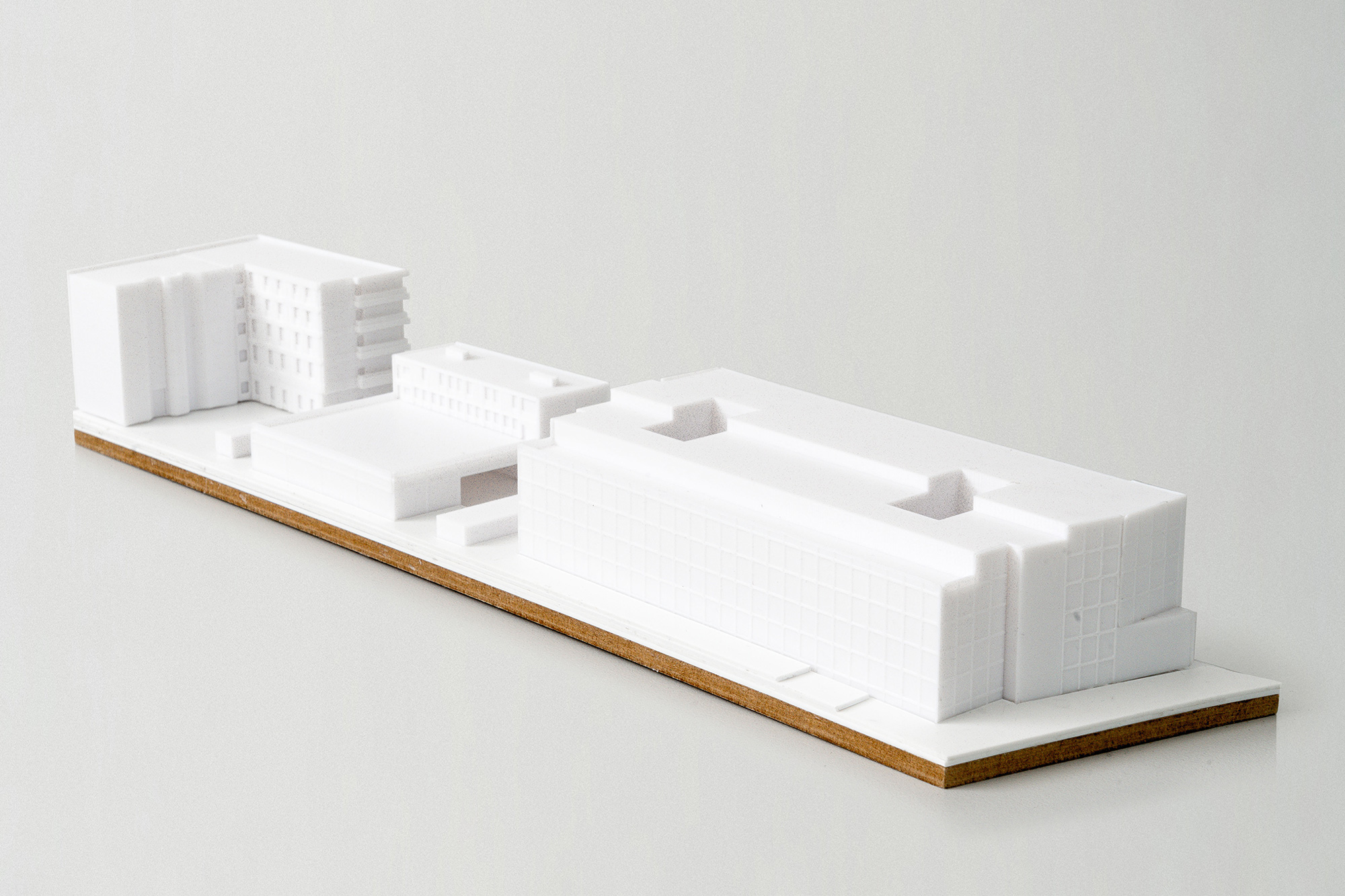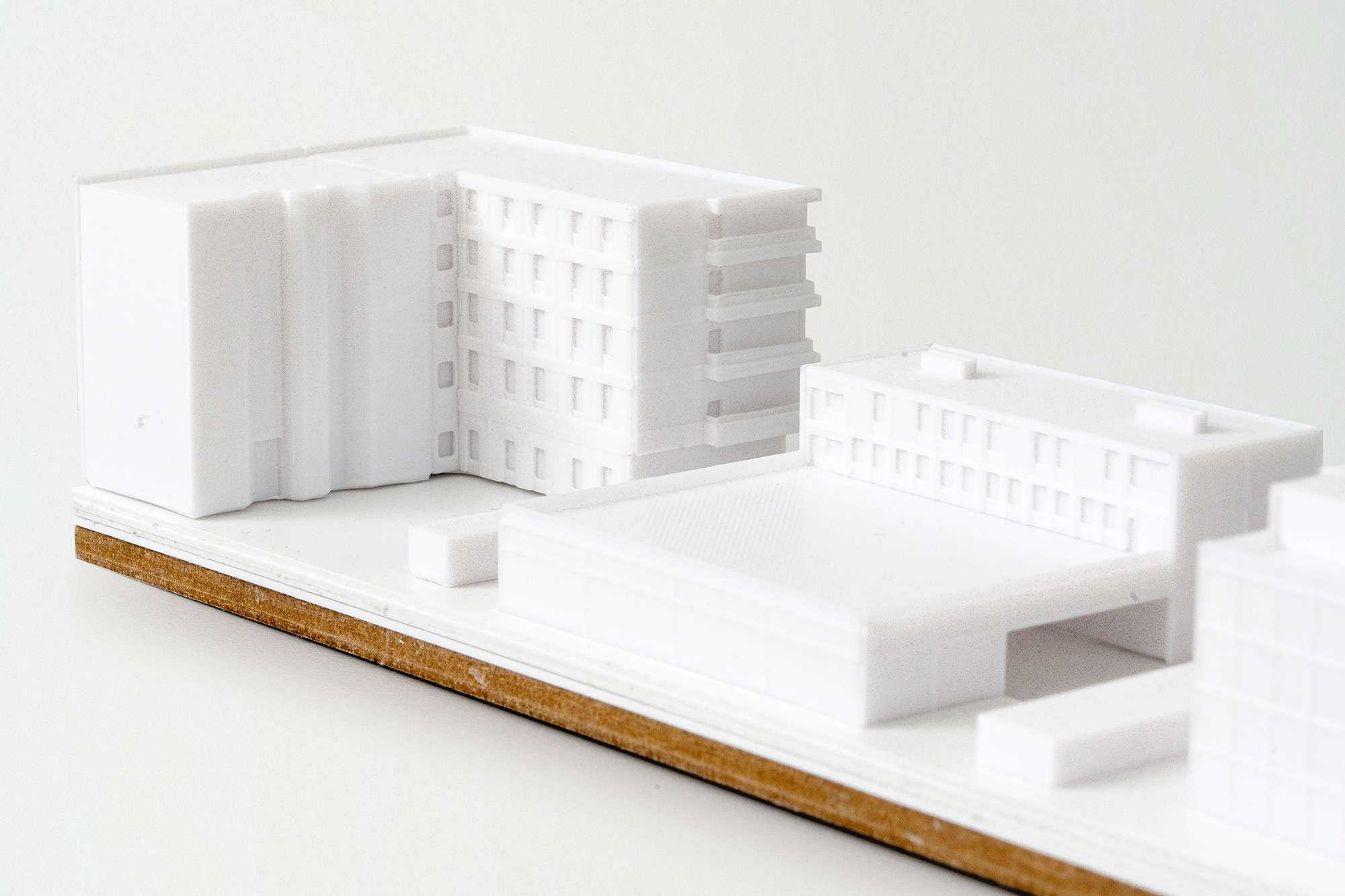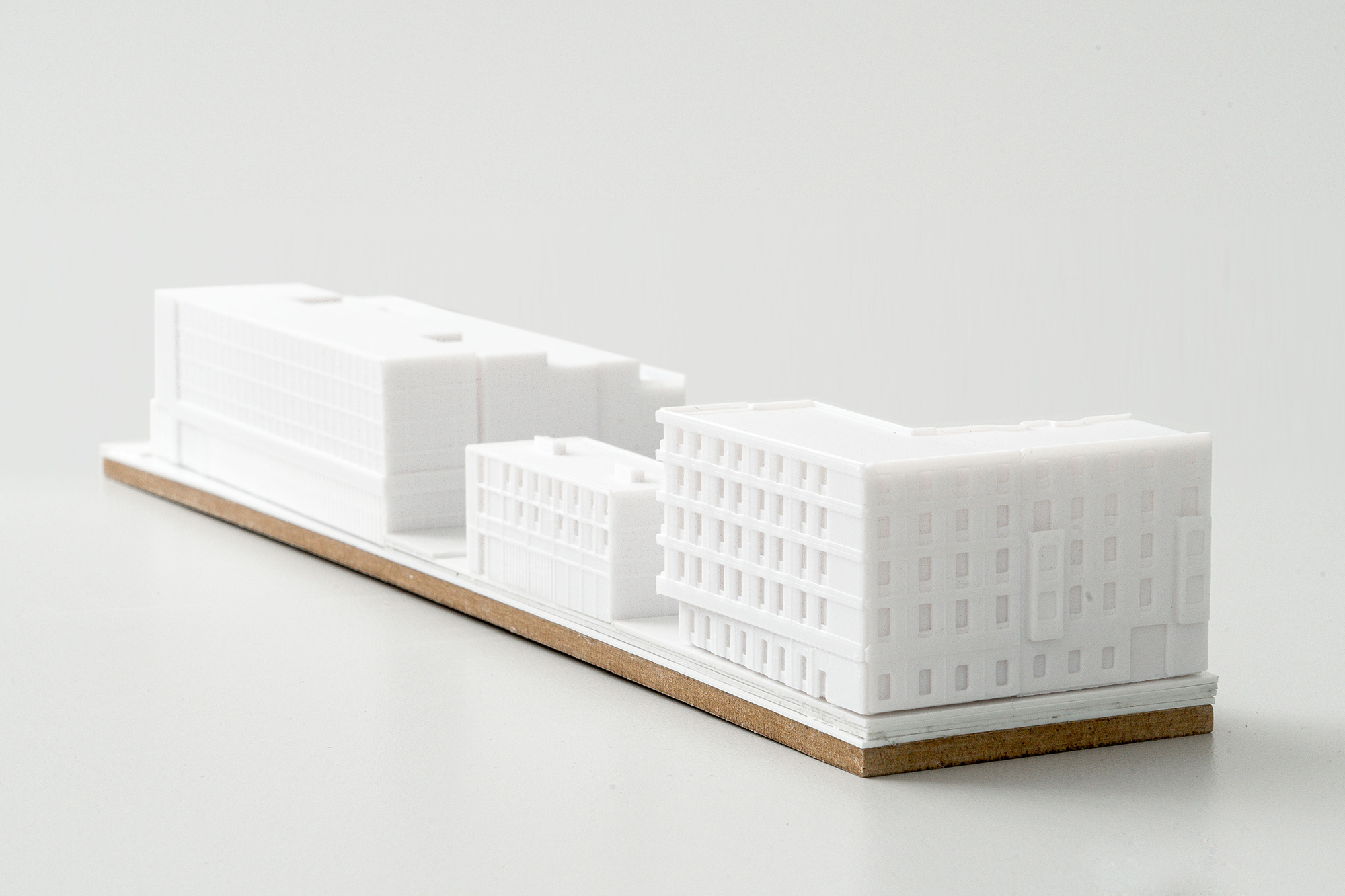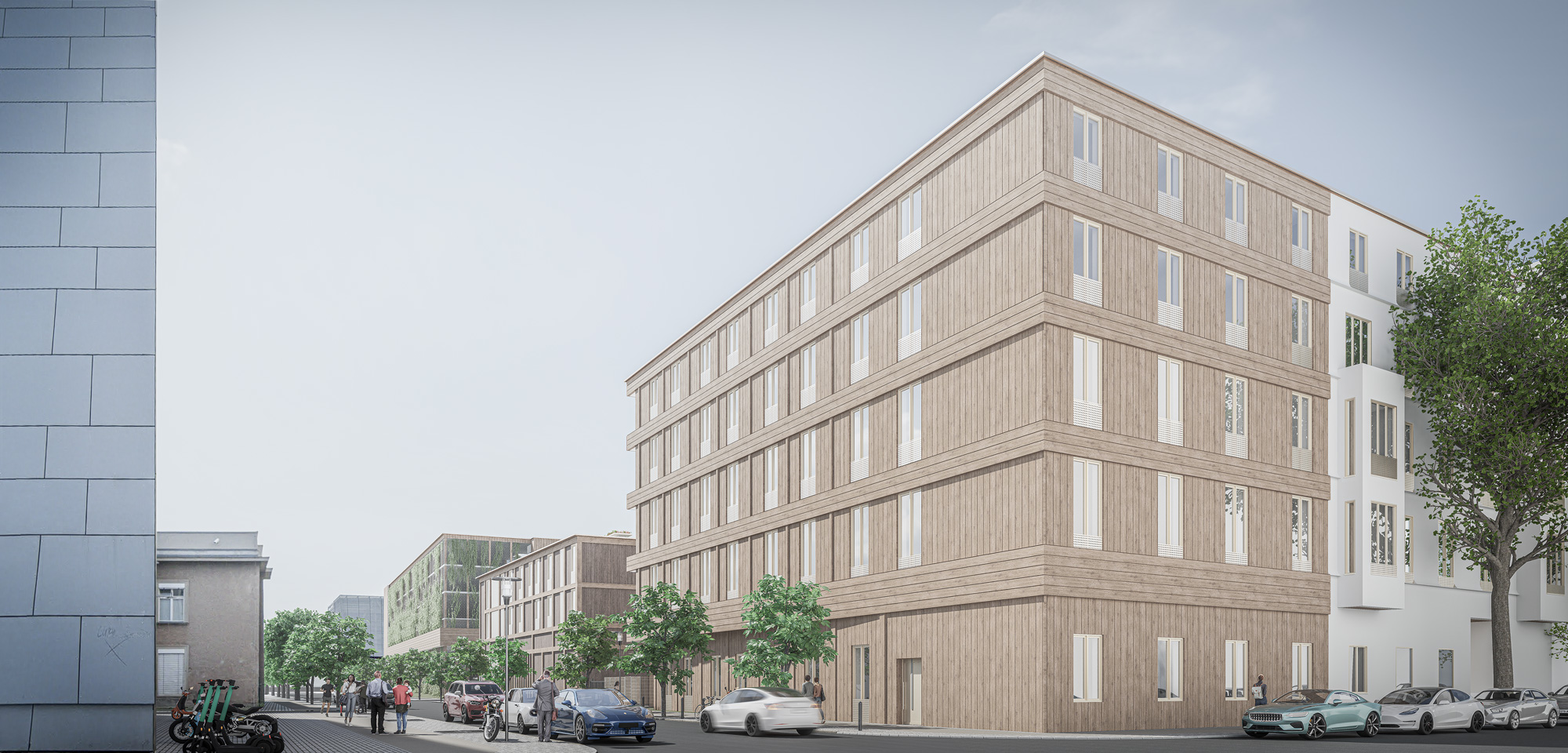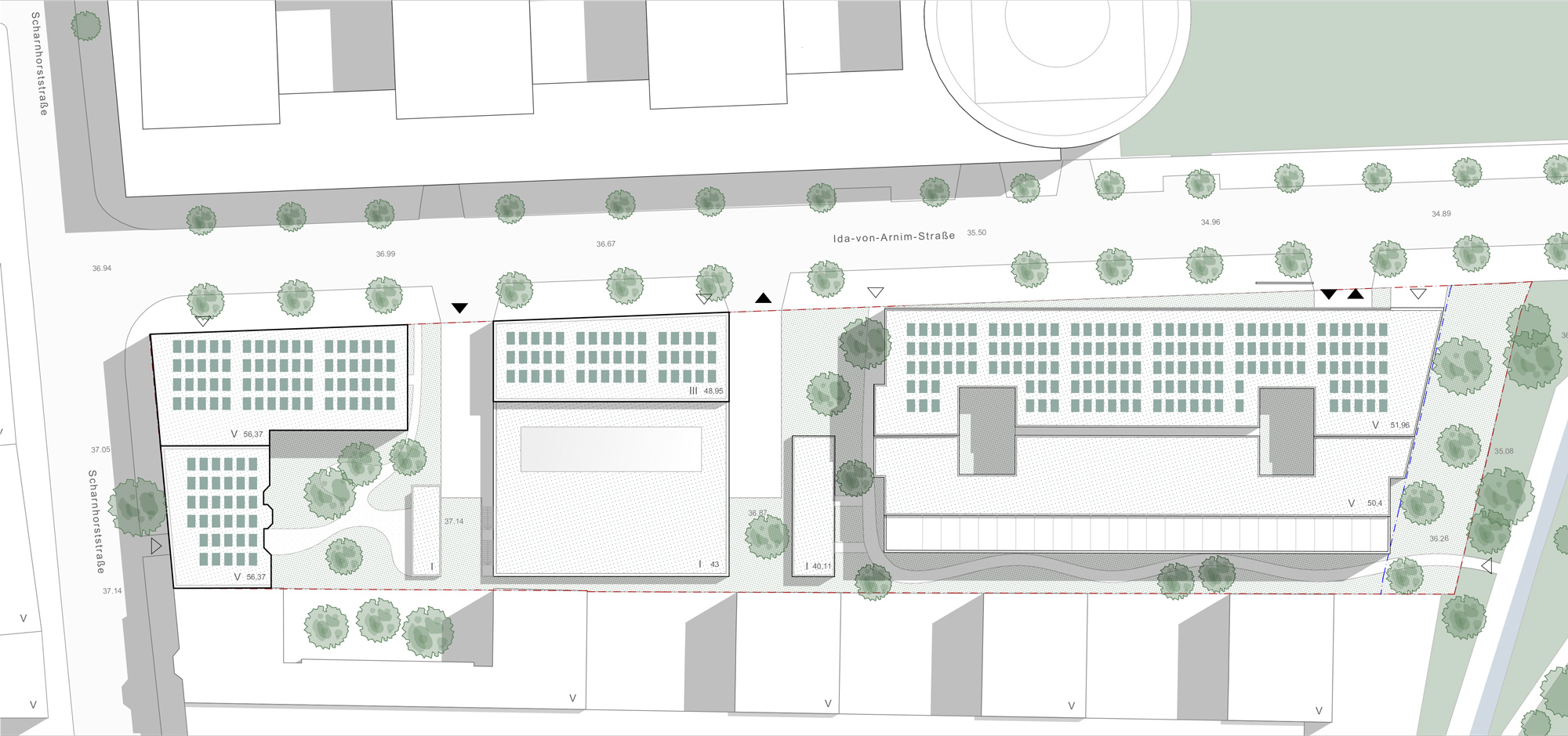 Die Herausforderung des Entwurfes ist es, eine städtebauliche Lösung für die Positionierung von drei Nutzungseinheiten zu entwickeln, die keine naheliegenden Schnittstellen bieten und in Teilen sich im Nutzungsprofil sogar konterkarieren. Wir haben uns daher entschlossen, die Volumen zu trennen und ihnen eine gleichwertige städtebauliche Gewichtung innerhalb der typischen Berliner Blockstrukturen zu ermöglichen. Der in der Umgebung vorherrschende Blockrand wird dabei zwar aufgebaut, aber zugleich bewusst gebrochen. Ziel ist es an ausgewählten Stellen subtil aus strikten Fluchten ausbrechen, das Gesamtensemble aufzulockern und so den Passanten eine Abwechslung zu bieten. Zeitgleich können wir so den Bau in sinnige Abschnitte unterteilen. Das Parkhaus als dringlicher erster – und temporärste – Baustein, bildet den nördlichen Abschluss des Areals aus und schafft ein kraftvolles Gegenüber zu den großmaßstäblichen Volumen der Zentrale des Bundesnachrichtendienstes jenseits des Pankeparks. Zeitgleich vermittelt er durch die Erdgeschosszone aber zu den kleinteiligeren Strukturen in Richtung Scharnhornstraße. Die städtebauliche Figur fokussiert sich auf möglichst kompakte Gebäudevolumina, bei gleichzeitiger Einfügung in die vorhandene städtebauliche Kontur mit Aufnahme der umliegenden Gebäudehöhen. Das Wohnen ist im Westen hin zur Scharnhornstraße in das Bestandsgebäude positioniert, das weitgehend erhalten wird und um eine Erweiterung zur Ausbildung der Blockrandkontur ergänzt wird. Zudem schaffen wir zum Inneren des Areals so den typischen Berliner Hof. Die Rettungswache liegt als einzelner Baustein zwischen Wohnen und Parken. Besonderes Augenmerk galt hierbei der effizienten Zusammenfassung der logistischen Flächen in einer Halle zur Emissionsminimierung und einem prägnanten Kopfbau. Letzteres vermittelt zwischen den ansonsten großen Volumen in der Straßenflucht und bietet das Potenzial für eine zukünftige Aufstockung.
