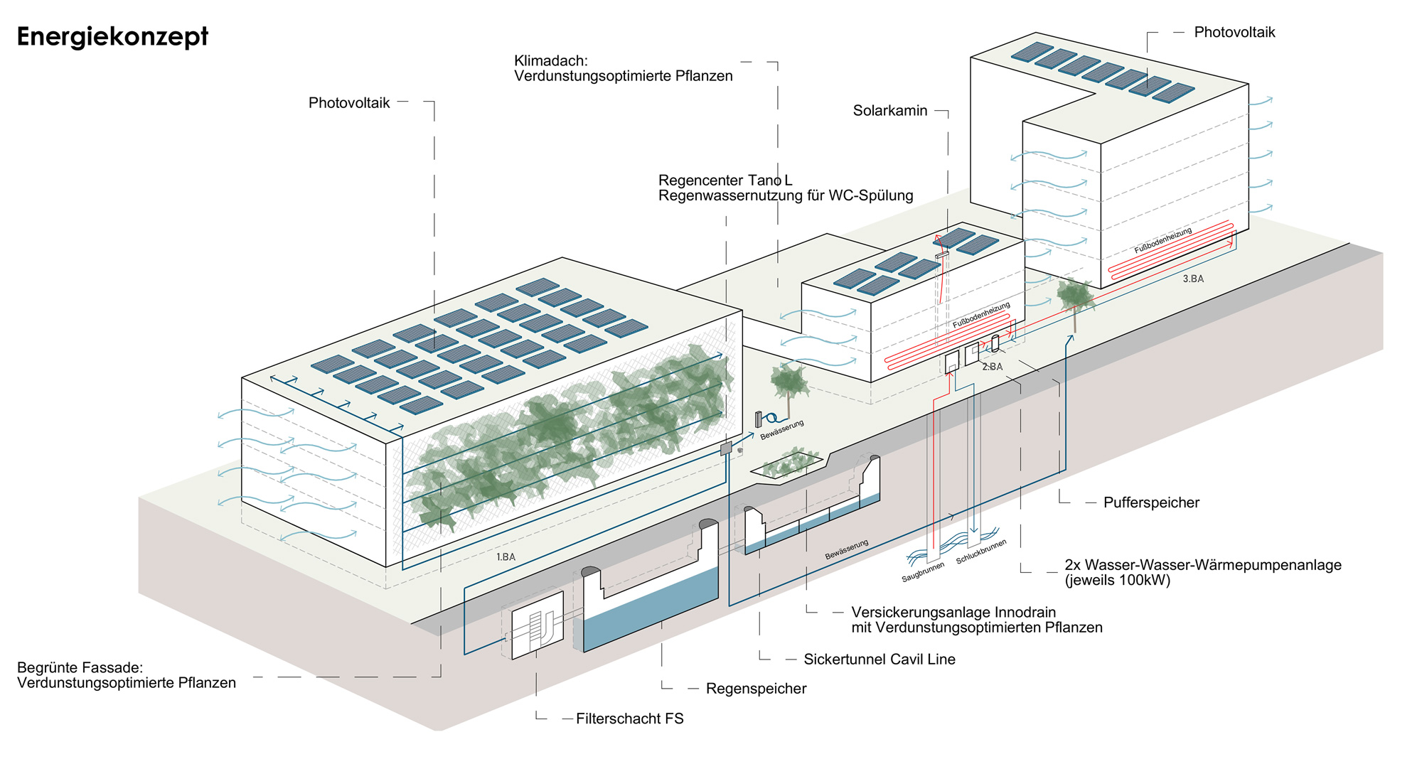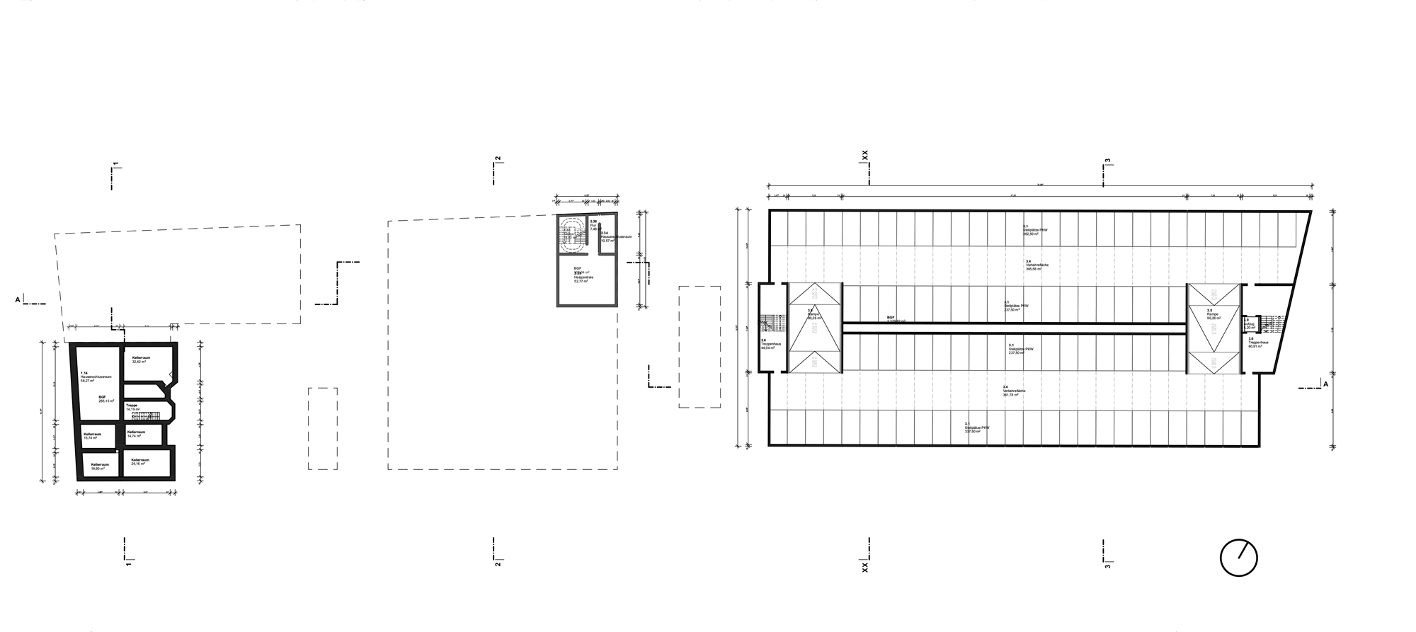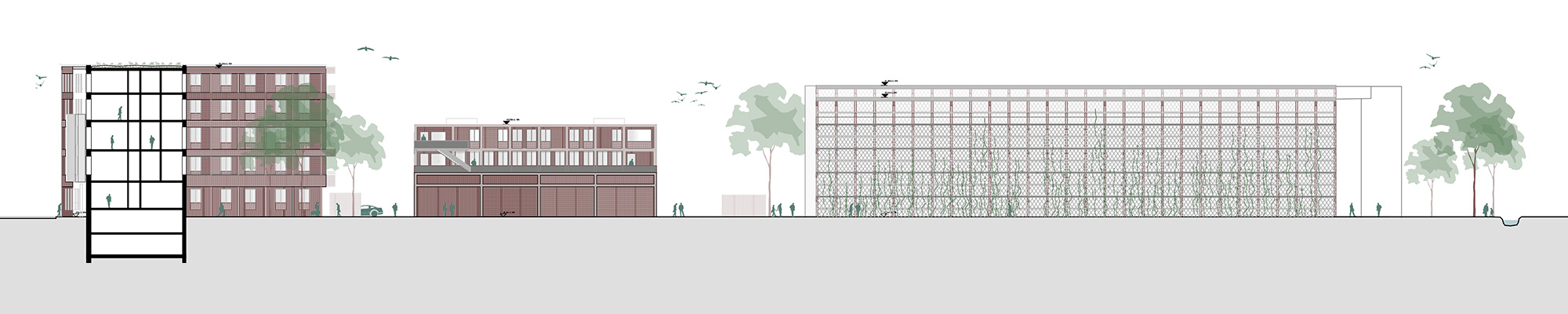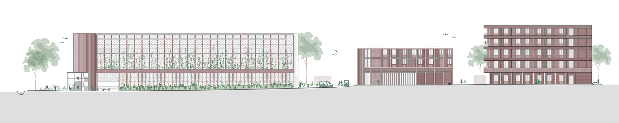 Ziel des Entwurfes ist es, für die geforderten ca. 550 Stellplätze die kompakteste Struktur zu entwickeln, die auf diesem herausfordernden Grundstück möglich ist. Das Parken wird als Splitlevel organisiert, wodurch möglichst lange, zusammenhängende Parkreihen bei wenig Flächenverlust durch Rampen und Verkehrsflächen eine hohe Effizienz bietet. Durch diese Organisation erreichen wir einen Durchschnitt von 19,0 m² je Stellplatz inklusive Verkehrsfläche. Die Kompaktheit erlaubt es, an den städtebaulich relevanten Punkten, insbesondere im Norden und gegenüber den Nachbarbauten wichtige Freiräume zu schaffen. Die Erschließungszonen grenzen sich von den rein funktional gehaltenen Ebenen des Parkhauses ab. Sie werden als erweiterter, öffentlicher Raum verstanden und sollen ein behagliches, sicheres Ankommen bieten. In der Bearbeitung der zweiten Phase haben wir uns entschieden, den ohnehin notwendigen Abtrag des Bodens von 4,0 Metern nicht wieder aufzufüllen, sondern ein Untergeschoss für das Parkhaus einzurichten. Hierdurch können wir Geschosshöhen bieten, die das Potenzial für Nachnutzungen des Parkhauses eröffnen und anstelle eines offenen, obersten Parkdecks, wasserbindende und biodiversitätserhaltende Dächer einzurichten. Die Fassaden werden aktiviert, die neben Grünraum auch Insekten und Vögeln einen Lebensraum bieten. Um eine natürliche Belichtung und Belüftung in der Mittelzone des Gebäudes für eine Minimierung des notwendigen Energieaufwandes zu ermöglichen, wurden zwei Lichthöfe eingerichtet. Im Falle einer Nachnutzung des Gebäudes in anderer Nutzung können diese die vertikalen Erschließungszonen aufnehmen.