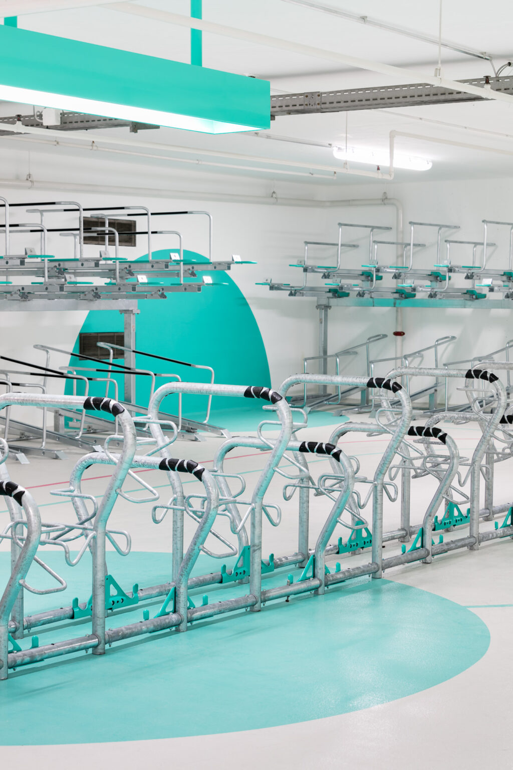 Die 5 Zonen der 1.280m2 großen Fläche wurden mit 5 frischen Farbtönen gekennzeichnet, die sich auch als Linienführung auf dem Boden sowie als Flächen an Türen und Wänden wiederfinden. In Anlehnung an gelernte ÖPNV-Netzpläne dient diese moderne Gestaltung zur Orientierung auf allen Flächen und wurde sogar ins offizielle Logo der Fahrradstation Süd übernommen.