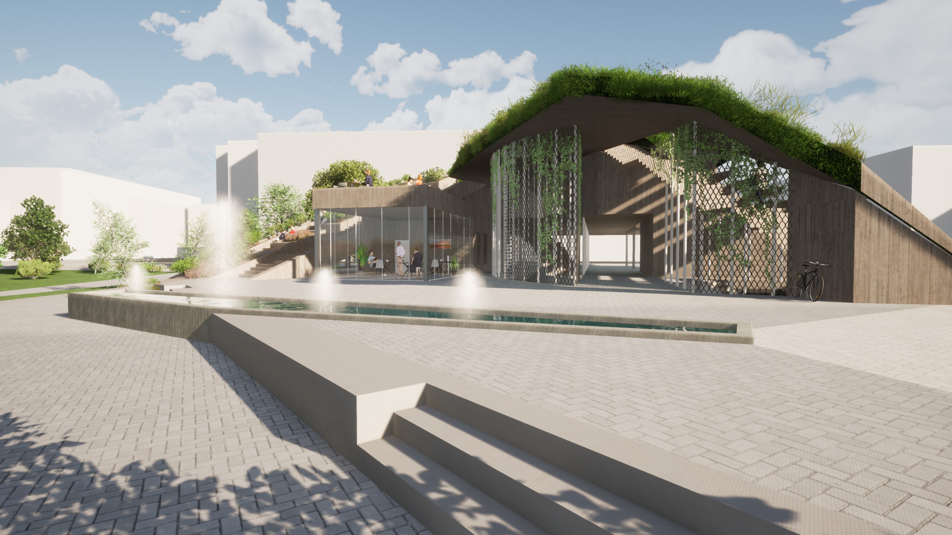 Der Bau gliedert sich äußerlich aus holzverkleideten Kuben mit dem sich darüberlegenden, intensiv begrünten Dach.