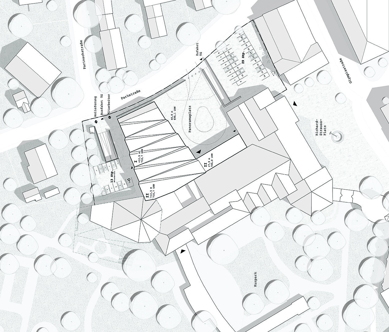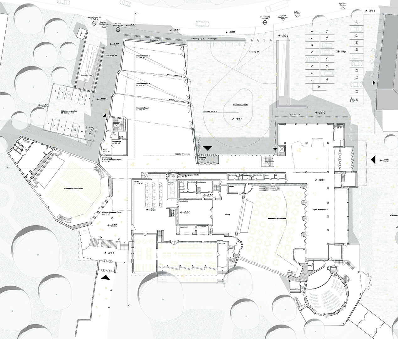 Das neue Panoramafoyer dockt als Einzelkörper direkt an das neue Erschließungsfoyer an und zielt in seiner zulaufenden Form auf den beliebten Aussichtsberg Wank. Entlang der südlichen Fassade entsteht ein neuer, dem Kongresszentrum zugehöriger öffentlicher Platz mit angrenzenden Parkmöglichkeiten. Die klaren Strukturen nach dem Umbau des Kongresshaus Garmisch-Partenkirchen machen das Gebäude zugänglich und leicht verständlich. Das zentrale Element ist hier die bandartige, klare Hauptachse vom Foyer des Werdenfels-Saals bis zum Foyer des Richard-Strauss-Saals, an der sich alle Einrichtungen zu beiden Seiten reihen. Optimale Orientierung ist garantiert.