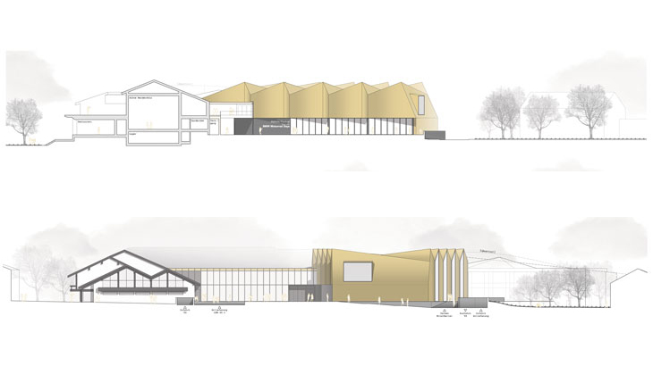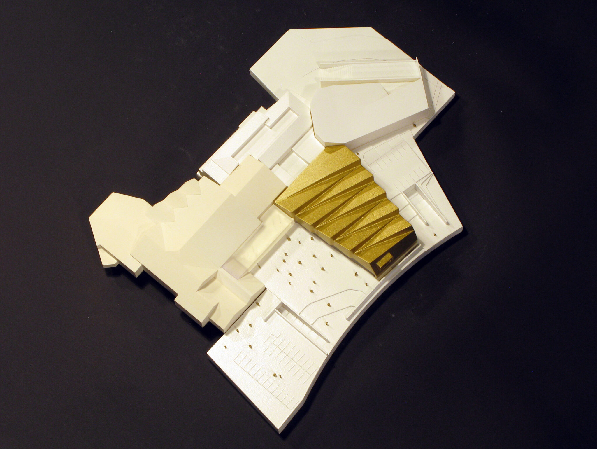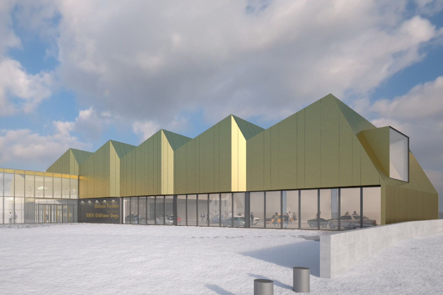 Materialität, die besondere Geometrie und das Aufgreifen der bestehenden Annex-Struktur sowie die deutlich verbesserte Erschließung und die funktionale Zuordnung der Nutzungsbereiche durch einen neuen Verbindungsbau haben das Potenzial, die Erweiterung des Kongresshauses Garmisch-Partenkirchen tatsächlich zu einem weiteren Wahrzeichen werden zu lassen. So reduziert das Innere gestaltet ist, so auffällig ist das Panoramafoyer mit seiner gefalteten Dach- und Fassadenhaut, die mit länglichen brünierten Messingplatten gold-braun schimmert.