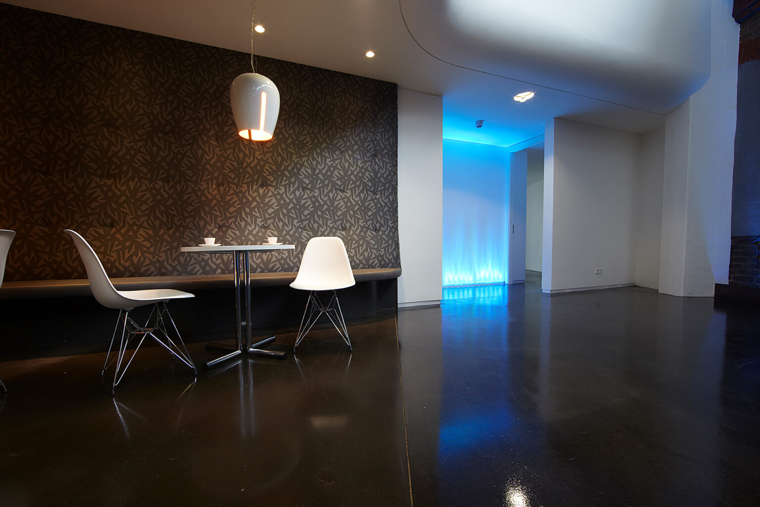 Die beinahe schwerelos schwebende Galerie bildet mit ihrer weißen, glatten und abgerundeten Form einen interessanten Kontrast zur Fassade, fügt sich jedoch harmonisch in die bestehende Betondecke ein und wird zu einer homogenen Einheit. Ein Effekt, der durch die Rundung der Brüstung und die ausfallenden Enden der Galerie noch verstärkt wird. Genau unter der Galerie, entlang einer frei geformten Kurve, befinden sich der Loungebereich sowie weitere Nebenräume. Ausreichend Raum zur kreativen Entfaltung.
