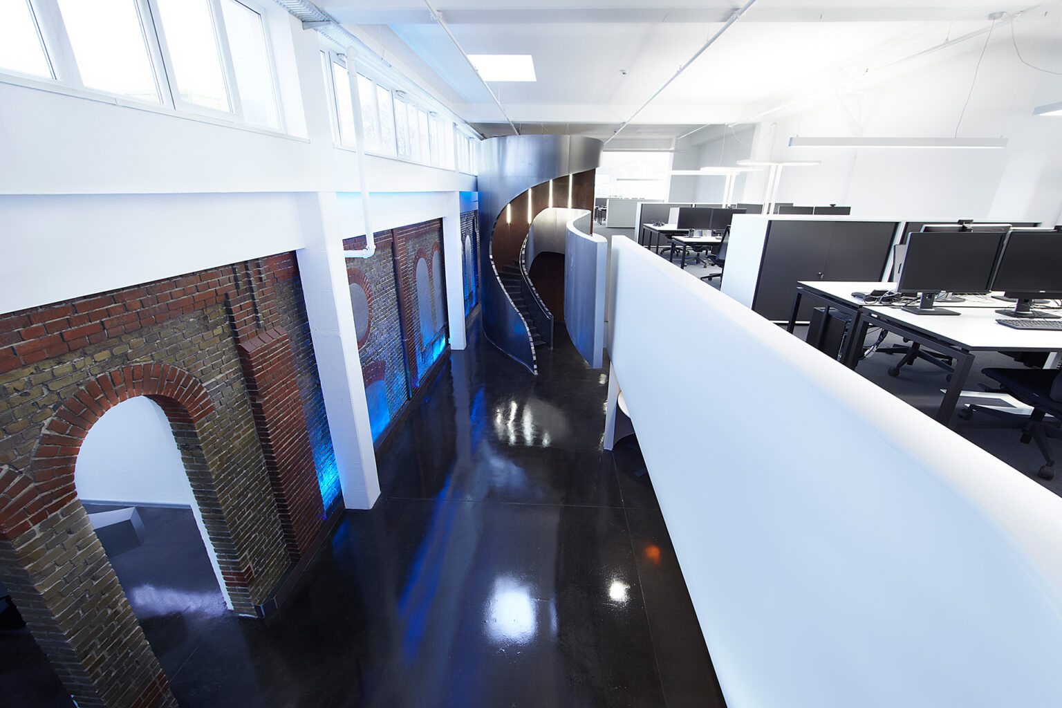 Und so besteht unser realisierter Entwurf aus einer Eingangshalle mit einladendem Empfang und gegenüberliegendem großzügigen Besprechungsraum – alles innerhalb der historischen Substanz. Nachdem zwei Rundbogentore freigelegt wurden, gelangt man nun ins Loftbüro mit Galerie und Raum für bis zu 70 Arbeitsplätzen. Die Segmentierung findet hier ihren Ursprung im Entwurf und nicht in der Möblierung. Zusätzliche Neben- und Sozialräume wurden unterhalb der Galerie angeordnet.