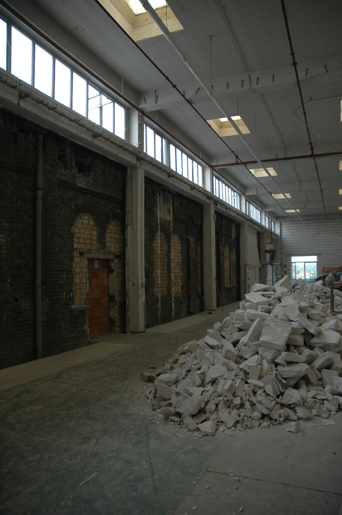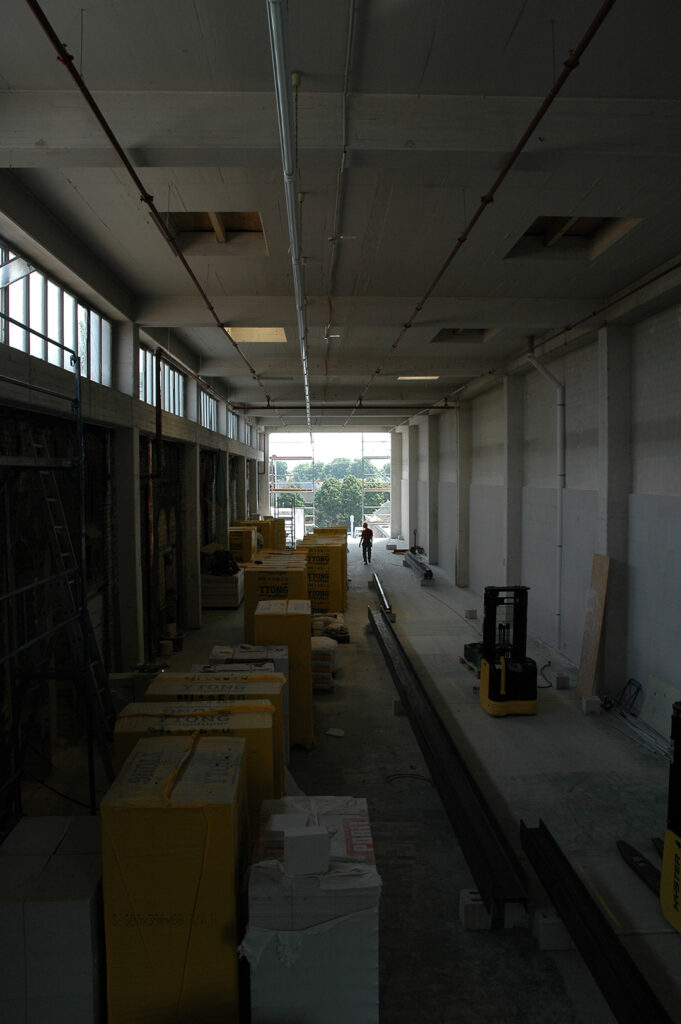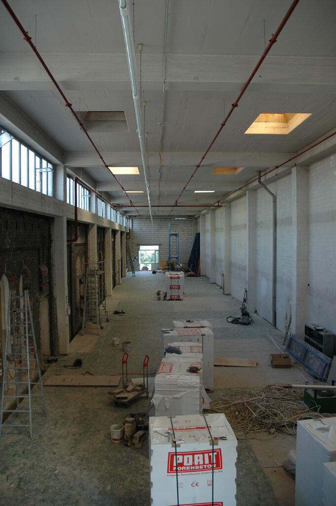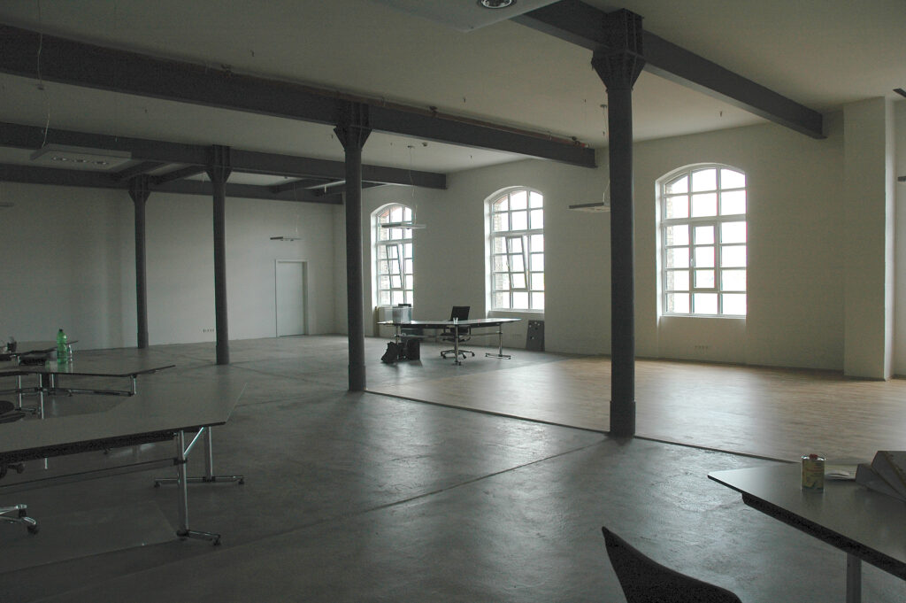 Von der Strandbar direkt am Hafenbecken aus bekommt man einen perfekten Eindruck der neuen (Arbeits-) Atmosphäre der historischen Fabrik. Hier tut sich was. Als die Eigentümer uns mit dem Entwurf, der Planung sowie der Bauleitung des Umbaus der Betonhalle beauftragten, setzten wir uns das gestalterische Ziel, die Qualitäten der Röhre herauszuarbeiten, den richtigen Umgang mit der historischen Substanz zu finden, um so eine effizient nutzbare Bürofläche im 2. Obergeschoss zu schaffen. Schließlich sollte in den weiteren Geschossen zusätzliche Miet- und Lagerfläche entstehen.