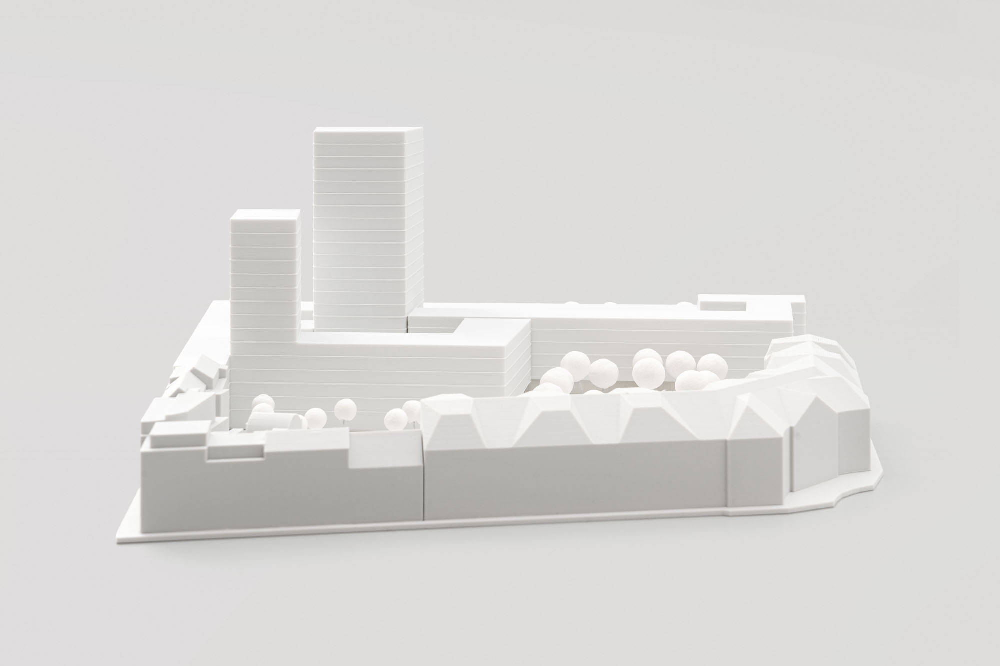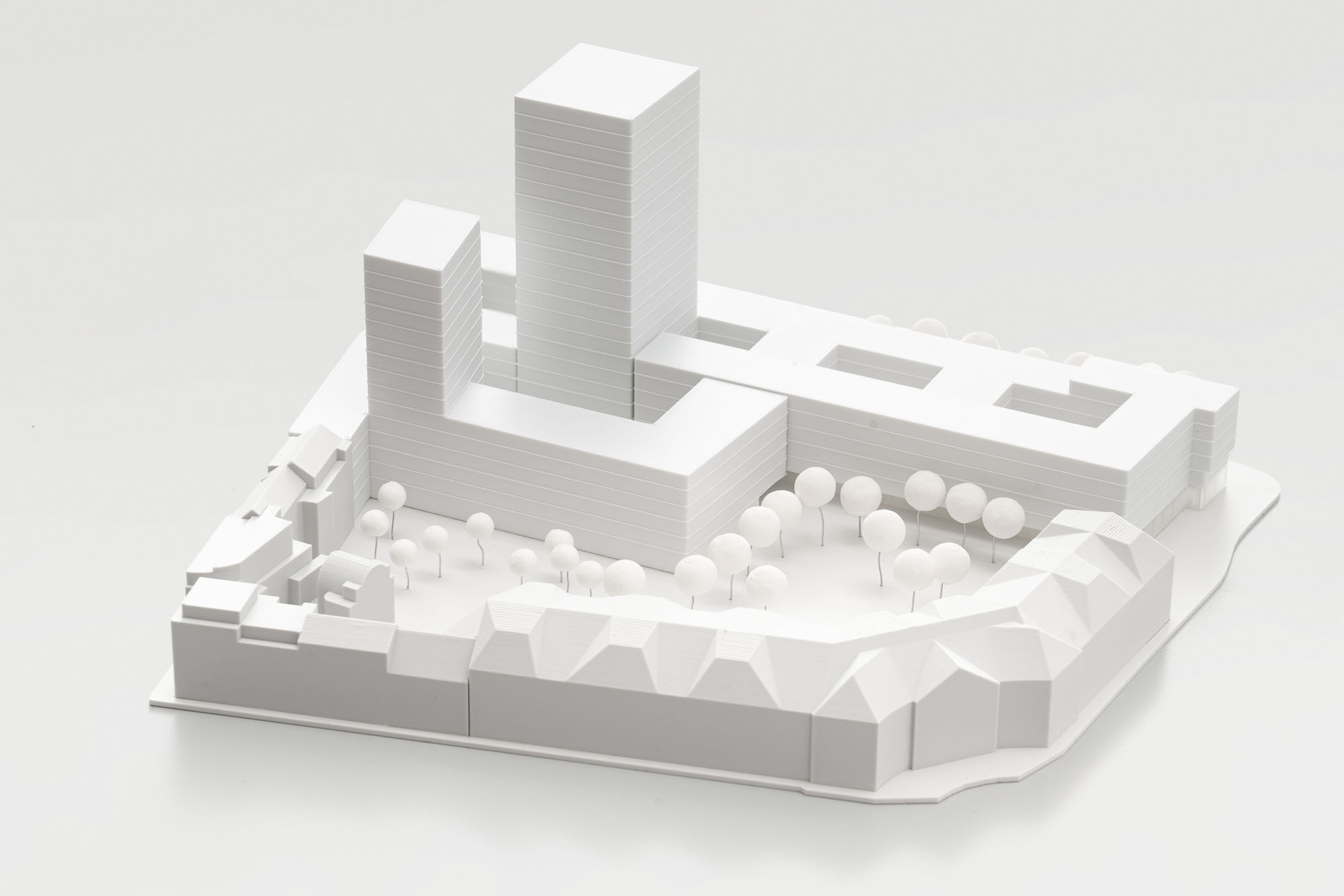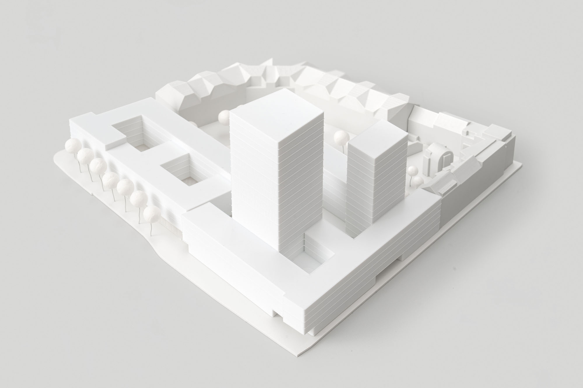 Der Entwurf für das Quartier K100 gliedert sich in drei eigenständige Bausteine mit unterschiedlichen Nutzungen: Wohnen, Arbeiten, Hotel und urbane Versorgung. Eine zentrale Markthalle, gemeinschaftliche Dachgärten und großzügige Innenhöfe schaffen Raum für Begegnung und Vielfalt im Alltag. Die Freiräume orientieren sich an der historischen Gartenstruktur des Markgräflichen Palais und erweitern sich zu einem parkartigen Grünraum mit hoher Aufenthaltsqualität. Durch kompakte Logistik, Mobilitäts-Hubs und eine grüne Promenade wird das Quartier funktional vernetzt und zugleich städtebaulich eingebunden – ein zukunftsweisendes Stadtmodul, das historische Bezüge und neue urbane Lebensformen verbindet.