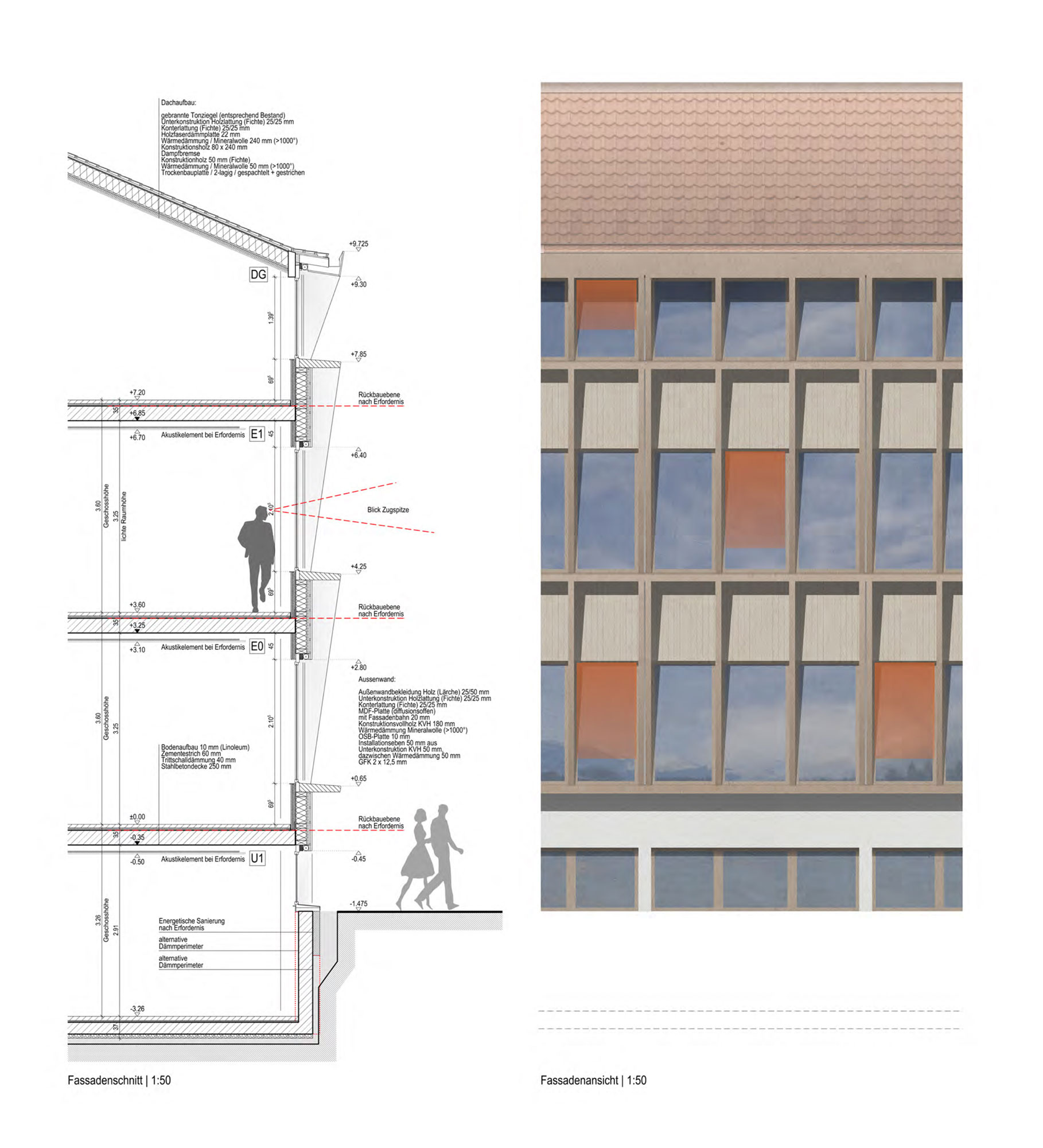 Fassaden seitig bleibt die Holzoberfläche unbehandelt. Durch den konstruktiven Holzschutz ist eine dauerhafte Fassade sichergestellt, welche mit Verlauf der Zeit durch den Verwitterungsprozess, sich hinsichtlich der Farbgebung wieder mit dem Bestandstrakt verbindet. Die Dacheindeckung erfolgt nach der Sanierung erneut mit gebrannten Tonziegeln, damit hier die Materialreferenz im Gesamtensemble gesichert wird.