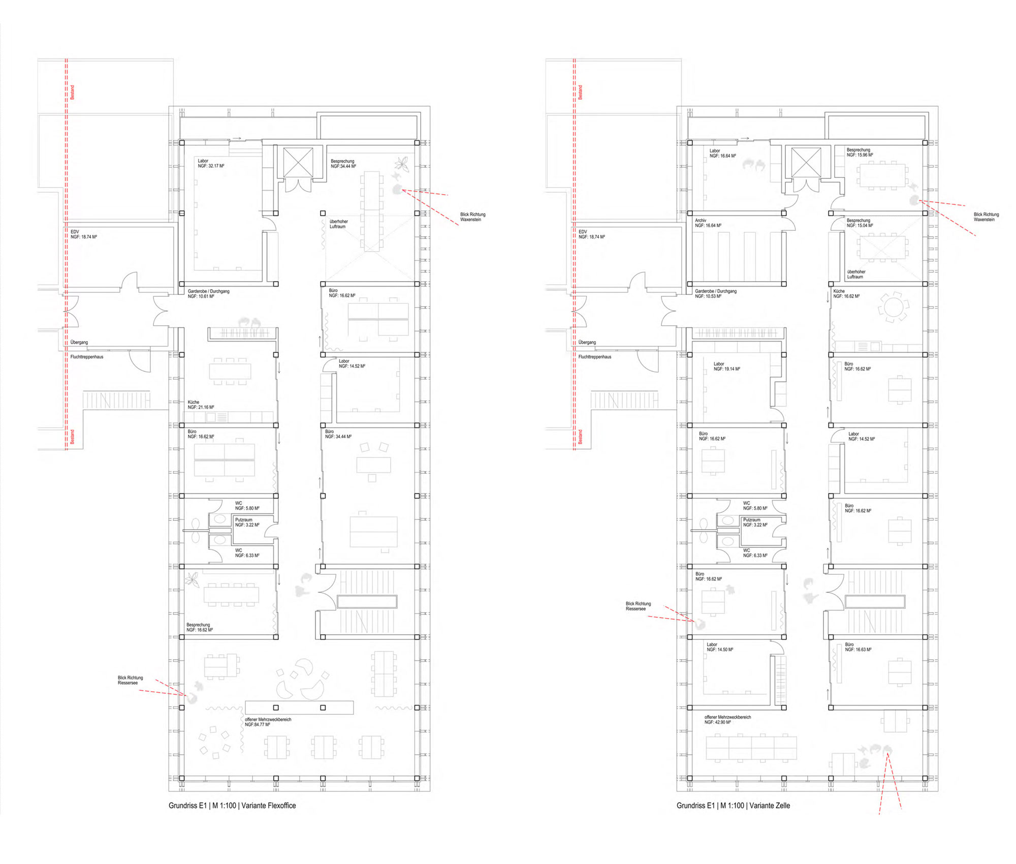 Neben der energetischen Fassadensanierung wird die bestehende Grundrissstruktur auf die statische Primärkonstruktion zurückgebaut. Der Stahlbeton-Skelettbau bietet bereits ein hohes Maß an Flexibilität für die gewünschten Labor – Typologien. Weitere Arbeitsgruppen der Departements können somit problemlos neu organisiert und in den Südwestflügel integriert werden. So kann auf ein Abbruch verzichtet werden und nachhaltig mit dem Bestand gearbeitet werden.