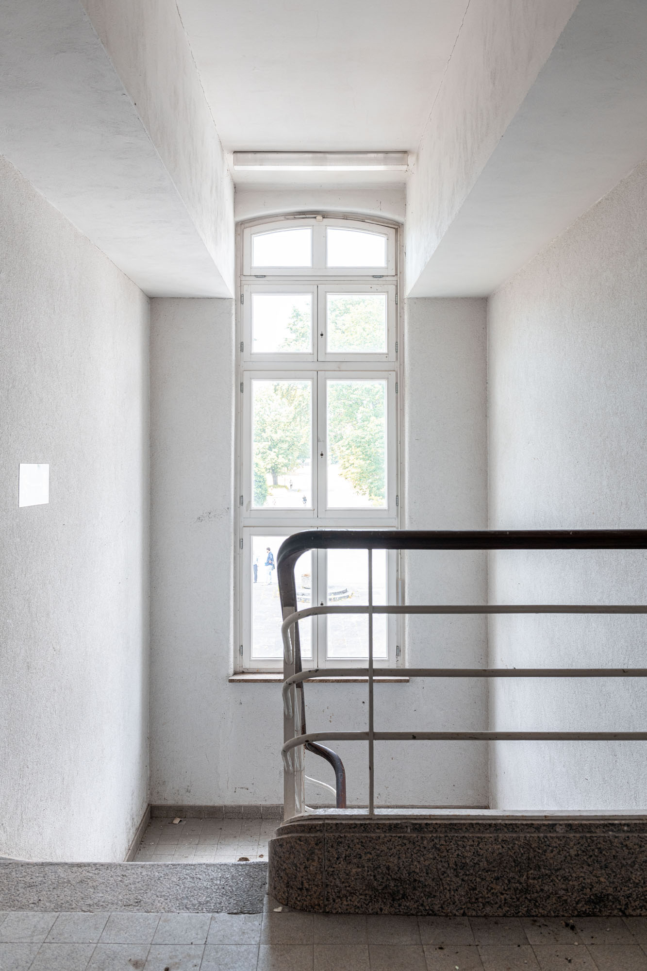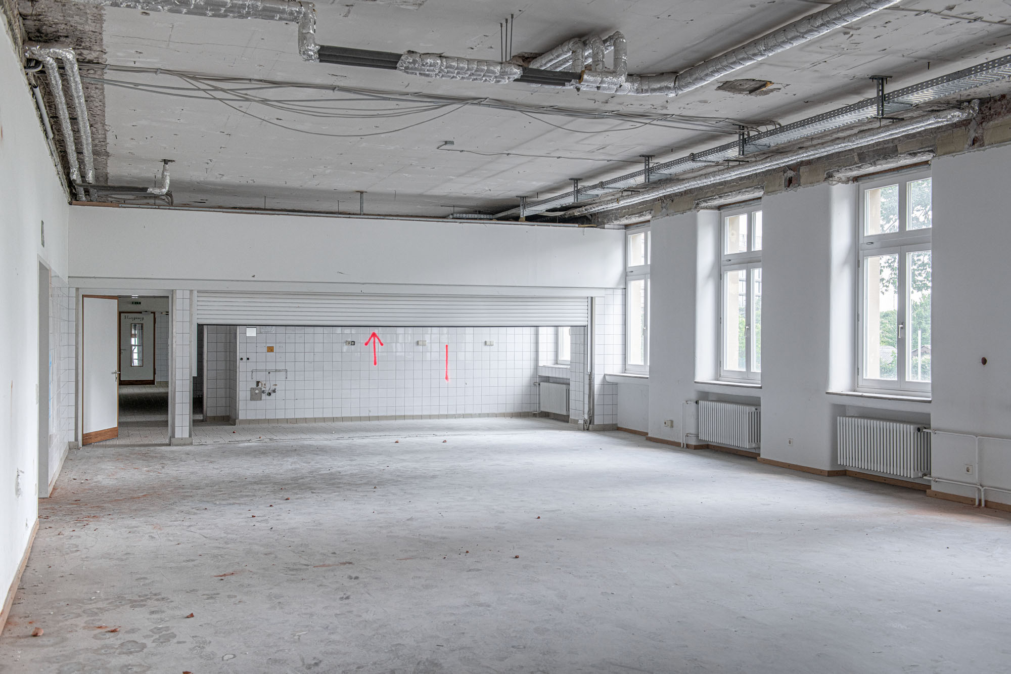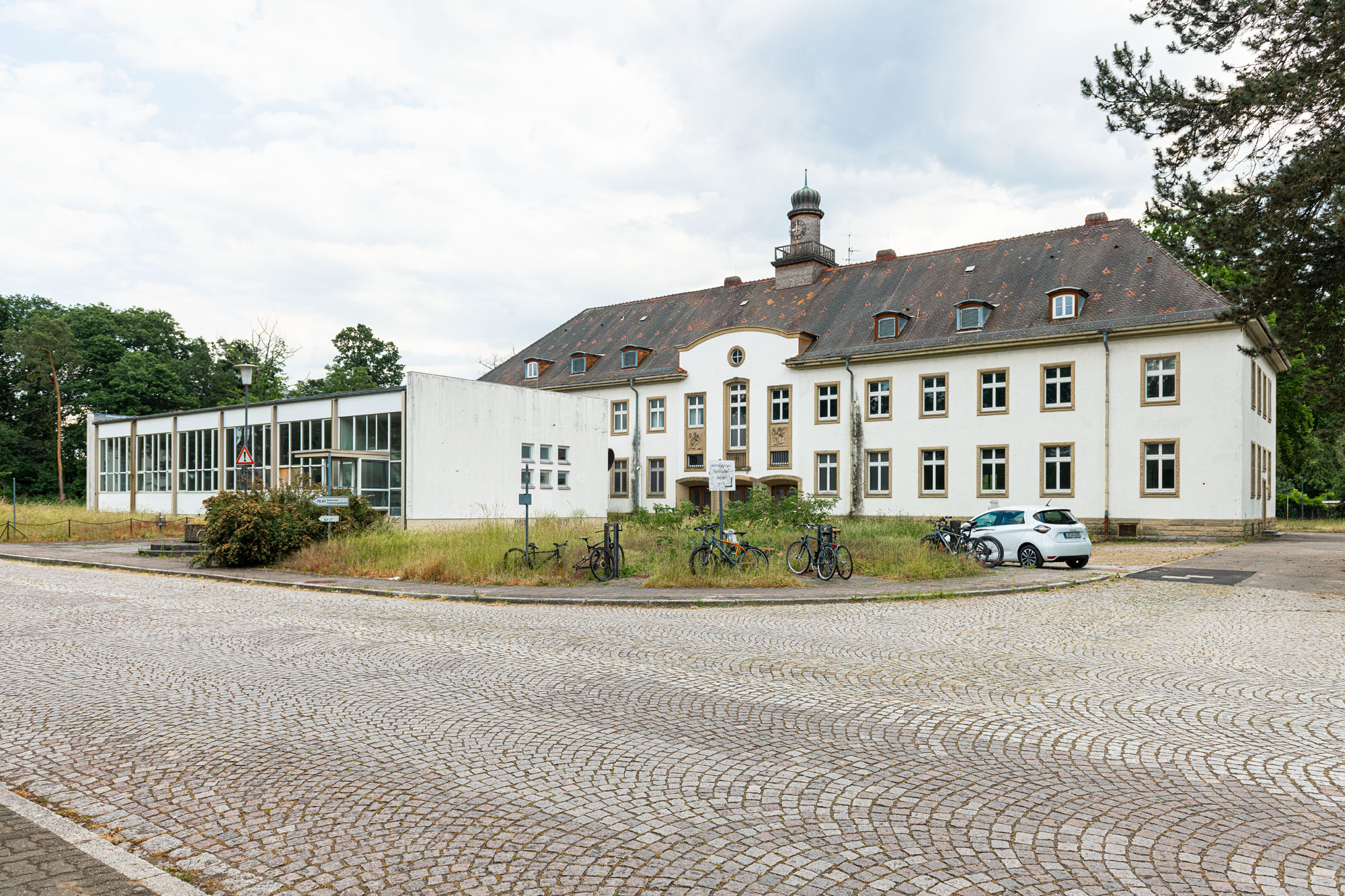 Das historische Gebäude wird entsprechend entkernt und von einer Bunkeranlage sowie späteren Anbauten aus den 70er Jahren befreit, sodass die ursprüngliche Symmetrie und die denkmalgeschützte Hauptansicht wiederhergestellt werden. Erhalten bleiben die drei originalen Eingänge, die Treppenhäuser, Decken und tragenden Wände sowie die Fassadenhülle – im Sinne eines respektvollen Umgangs mit dem Bestand. Die nicht denkmalgeschützten Bauelemente werden vollständig abgebrochen und durch eine funktionsgerechte Neubau‑Ergänzung ersetzt.