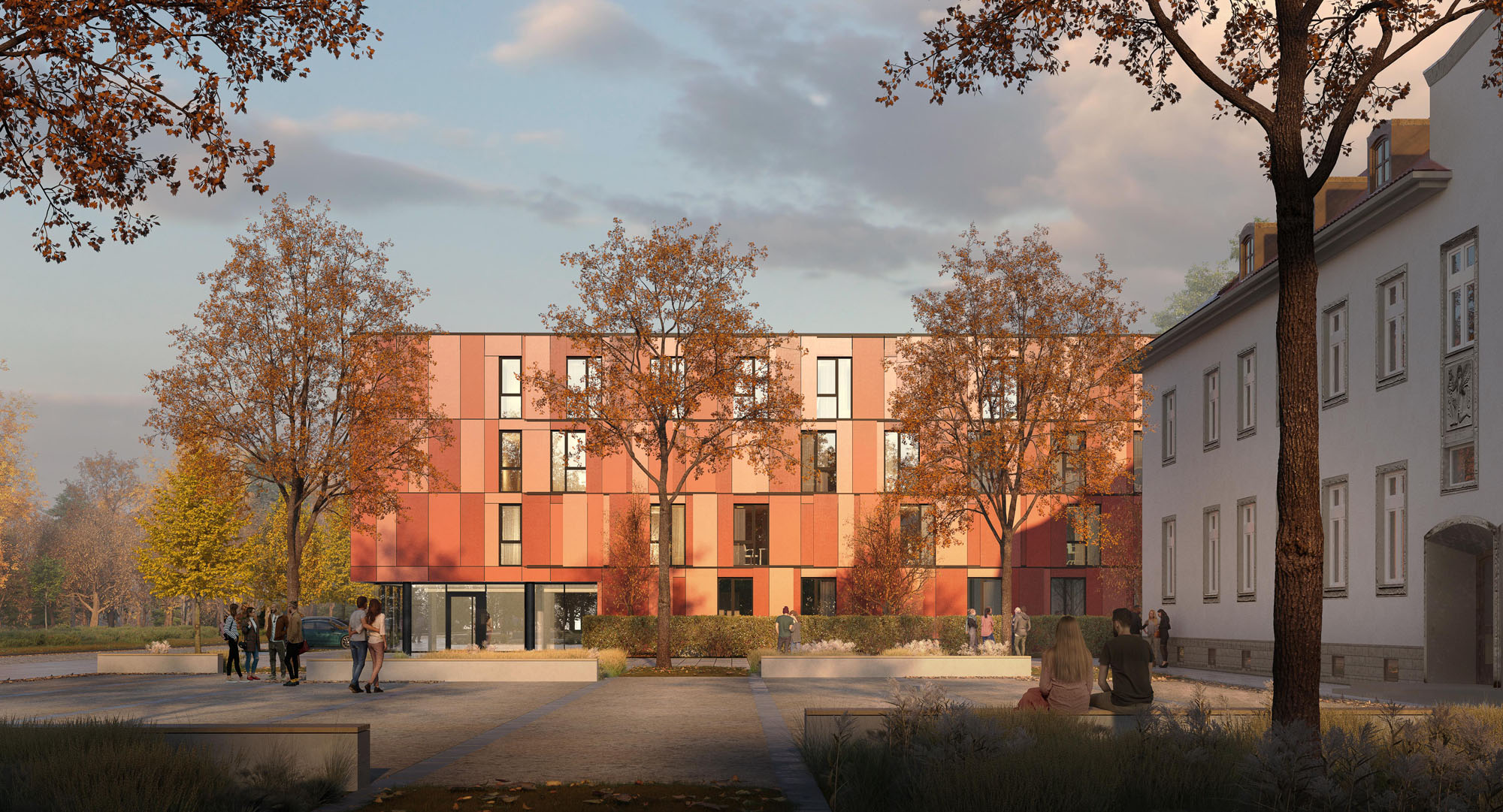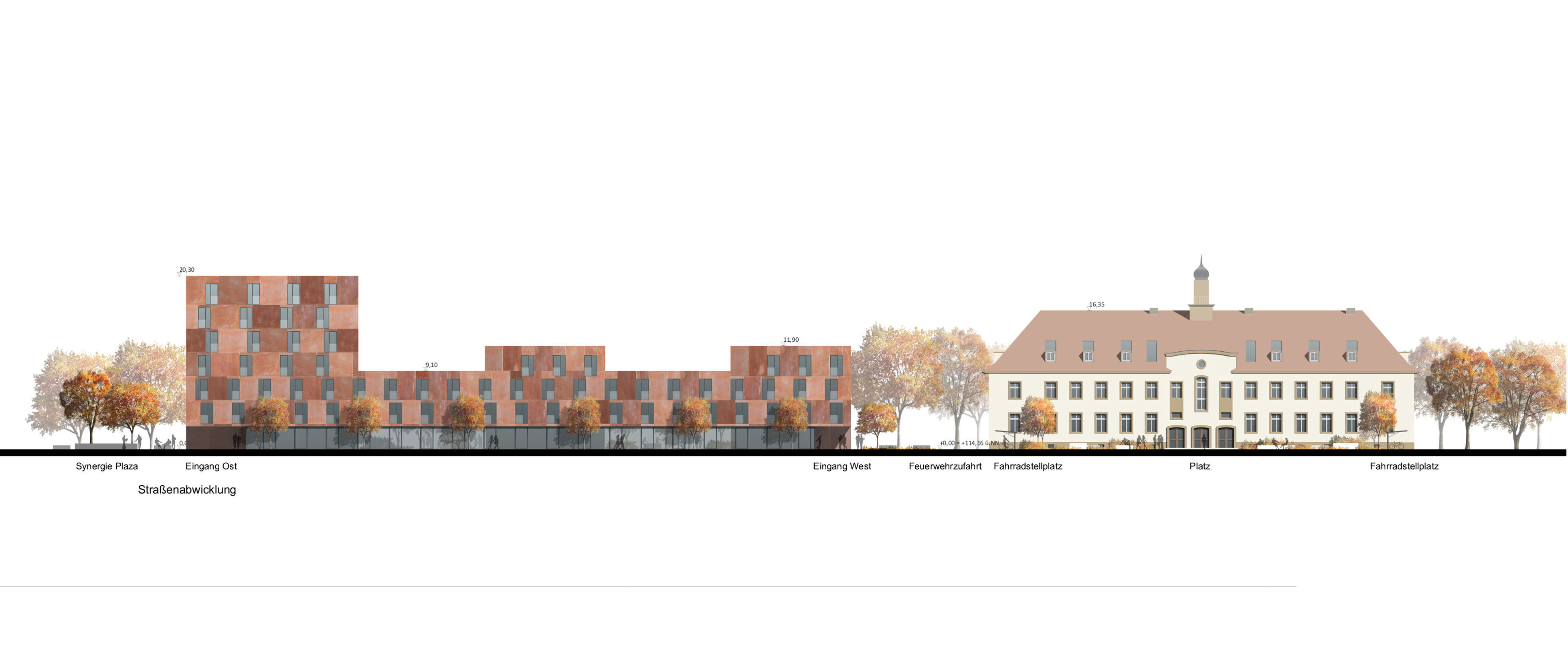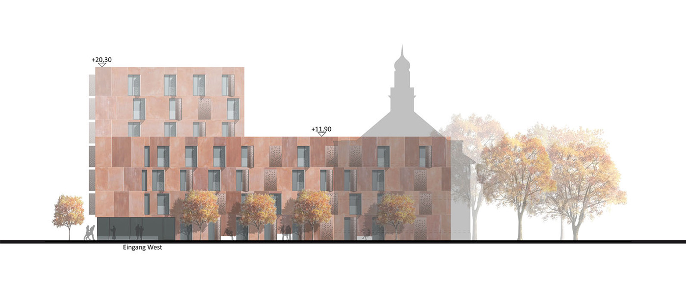Konstruktiv ist der Neubau als Stahlbeton-Schottenkonstruktion mit nichttragenden Außenwänden aus Betonfertigteilen geplant. Die Fassade ist als hinterlüftete Konstruktion mit Faserzementplatten ausgeführt – langlebig, robust und differenziert gestaltet. Großflächige Glasfassaden an Promenade und Eingängen sorgen für Offenheit und Transparenz. Der Sonnenschutz erfolgt im Bereich der Lochfenster mit in der Fassade integrierten Schiebeläden.