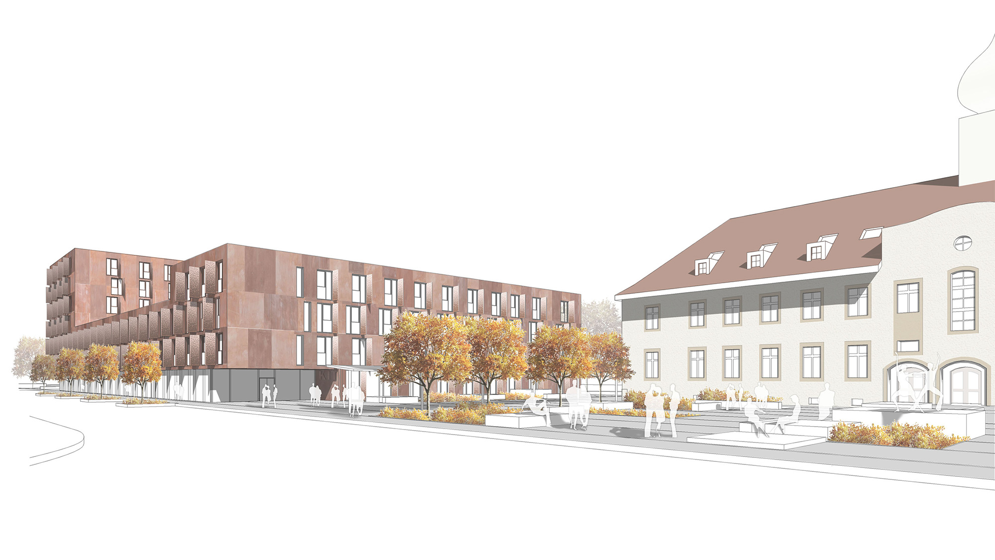 Der trapezförmig angelegte Neubau gliedert sich in drei höhengestaffelte Baukörper, die von vier bis zu sieben Geschossen reichen und durch zwei dreigeschossige Zwischenbauten miteinander verbunden sind. Der mittlere Gebäudeteil ist teilweise unterkellert, während der östliche Baukörper als siebengeschossiger Hochpunkt den Abschluss des Ensembles bildet und einen markanten städtebaulichen Akzent im Dialog mit dem Altbau setzt.