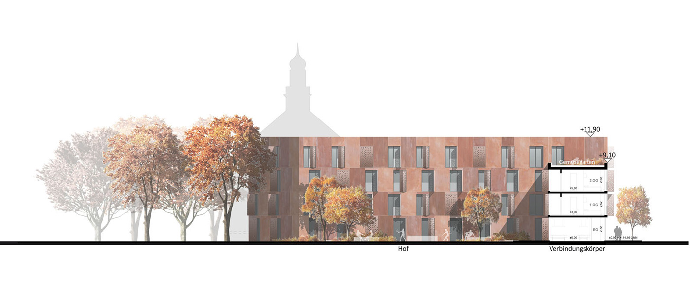 Über zwei Eingänge an den Gebäudeecken im Nordosten und Nordwesten erschließen sich die Treppenhäuser. Eine zentrale interne Promenade verknüpft beide Eingänge miteinander und schafft durch Gemeinschaftsräume, Musikraum und Werkstatt ein offenes Miteinander im Erdgeschoss. Zwei barrierefreie Apartments, vielfältige Lern- und Begegnungsräume sowie private Innenhöfe machen das Erdgeschoss zu einem sozialen Zentrum der Wohnanlage.