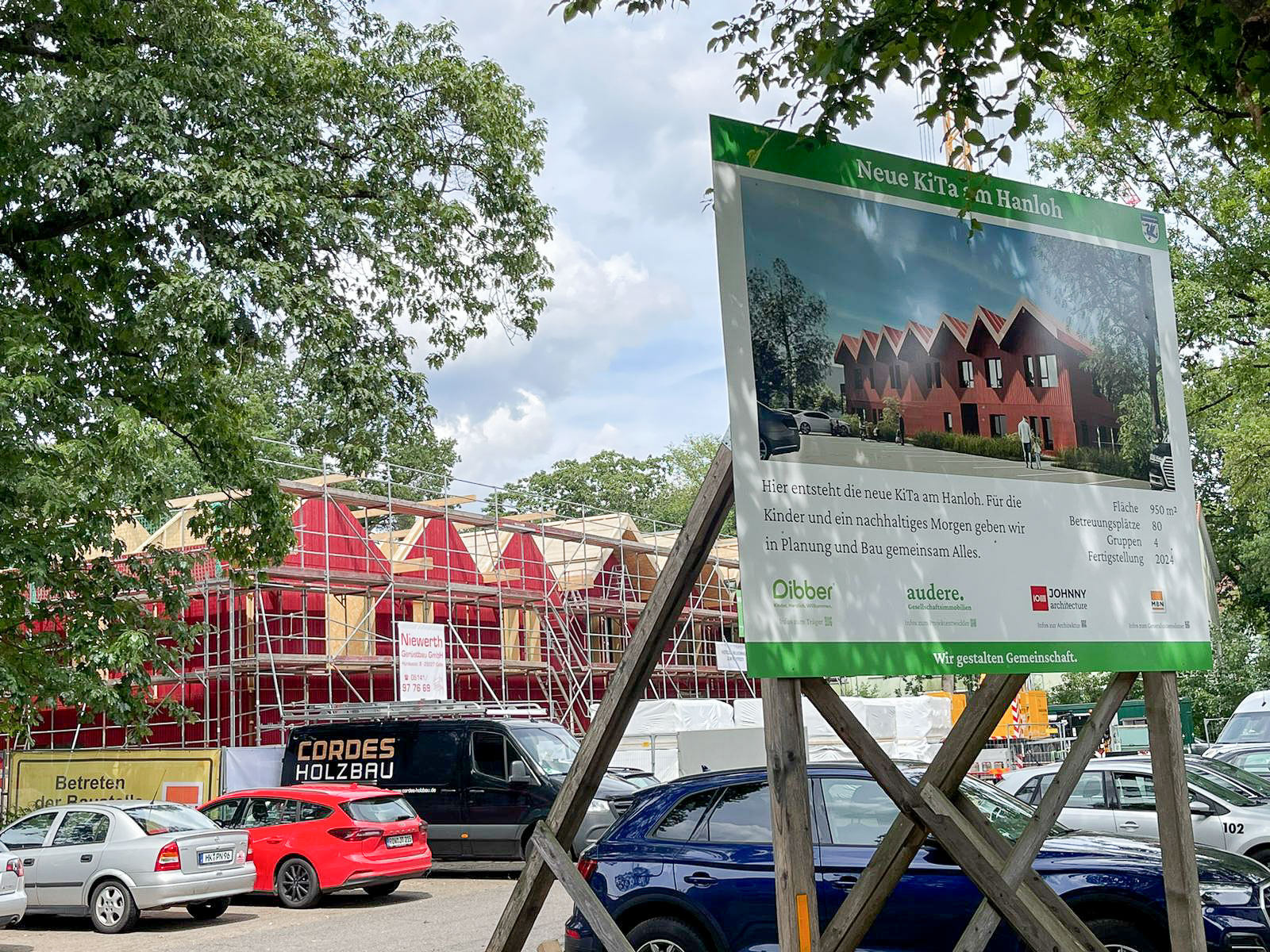 Die Nutzer der KiTa "Am Hanloh" profitieren von der nachhaltigen und auf gesundes Mikroklima bedachte Bauweise. Bauen mit Holz ist als ressourcenschonendste Konstruktionsart die Basis für “atmende” Bauten. Gemeinsam mit den Planungspartnern und dem Bauherrn audere Gesellschaftsimmobilien steigert die KiTa die Aufenthaltsqualität, indem wir soweit technisch möglich, auf Kunststoffe, Lacke und chemische Erzeugnisse verzichten.
