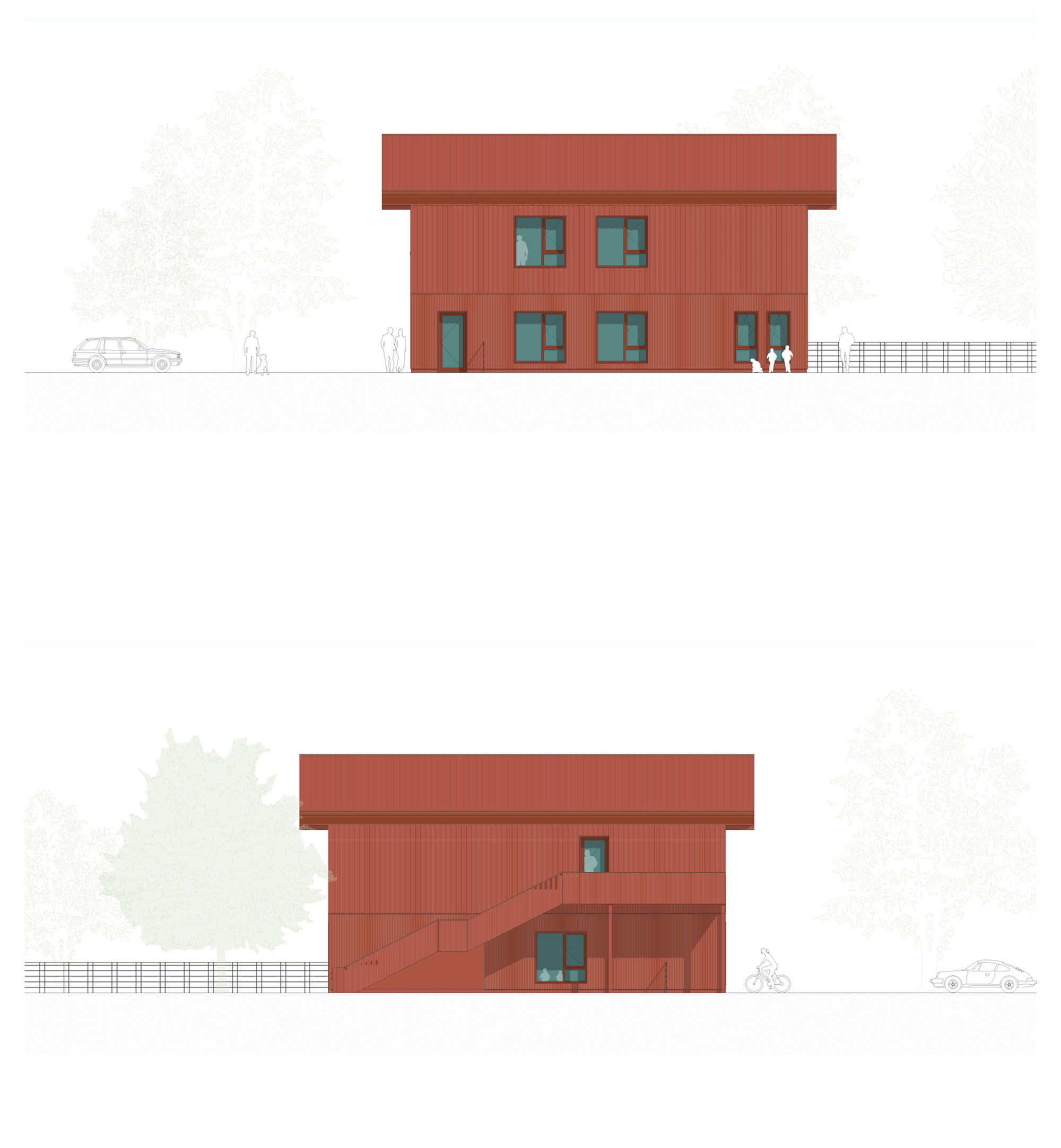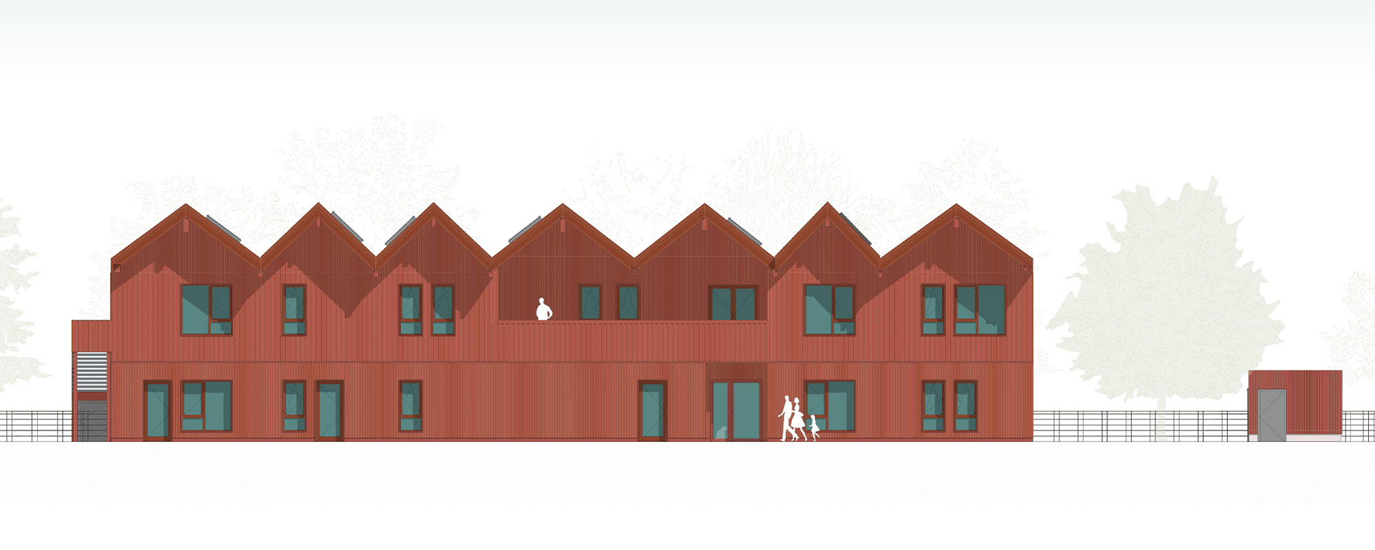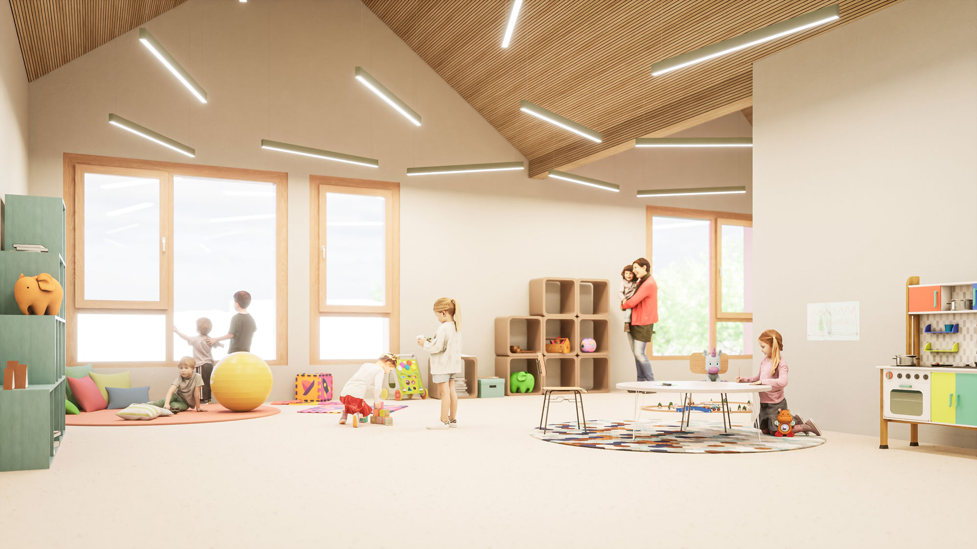 Im Vordergrund unserer Planungsarbeit stand das Wohlbefinden der wichtigsten Nutzer – der Kinder. Zusätzlich dazu sollten sie sich durch die Architektur und den Ort mit der KiTa identifizieren können. Dies haben wir durch eine farbstarke Fassade und eine Dachform, die einen fröhlichen Kontrast zu der weitläufigen, idyllischen Grünfläche und zu der Umgebung schafft, erreicht.