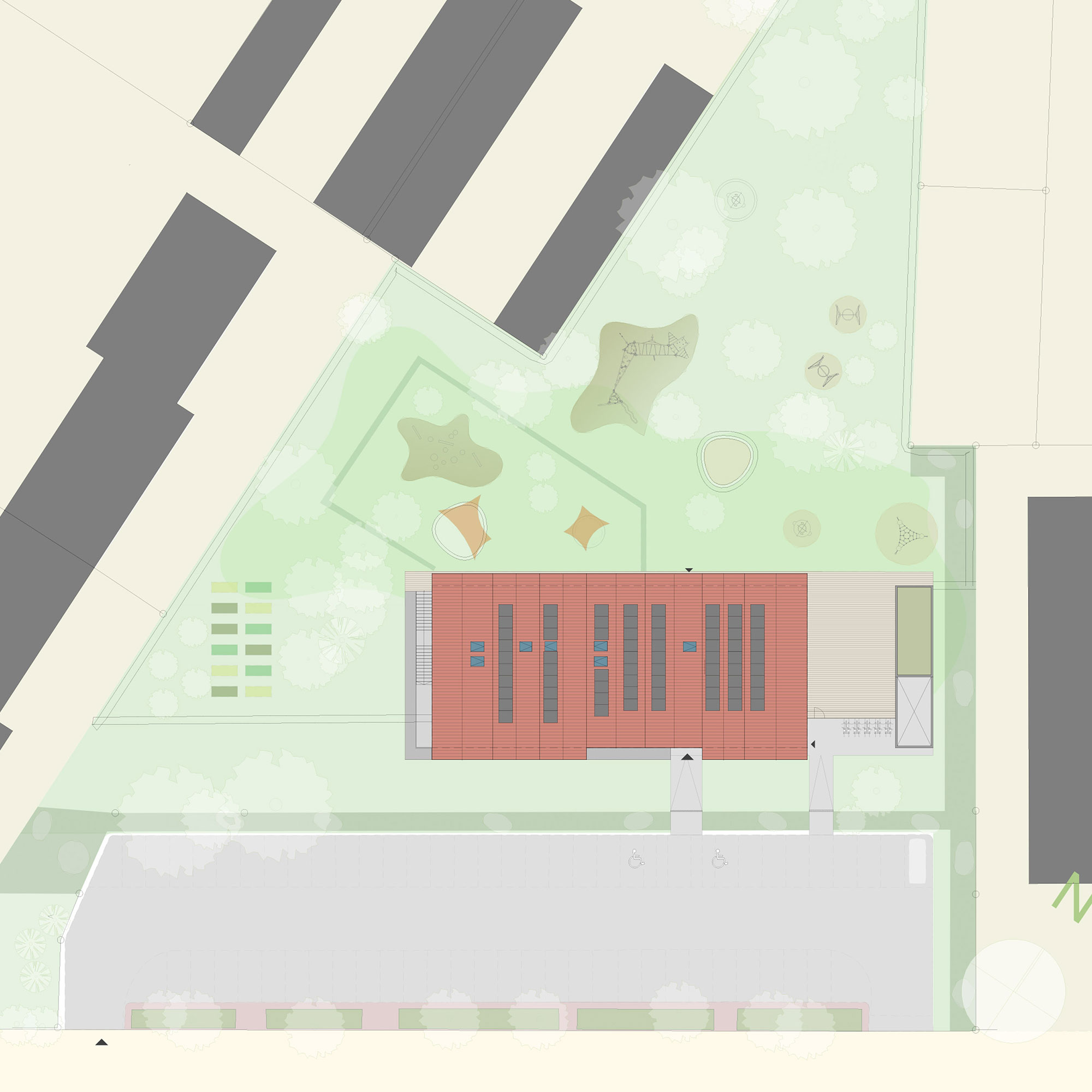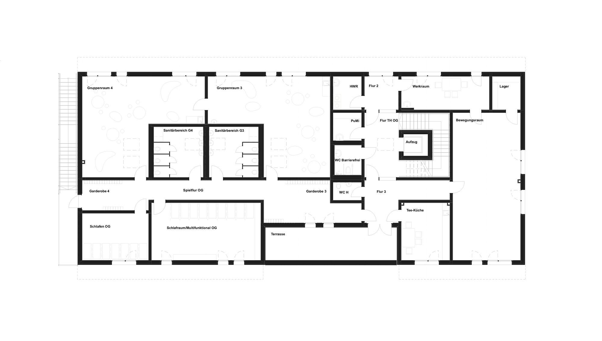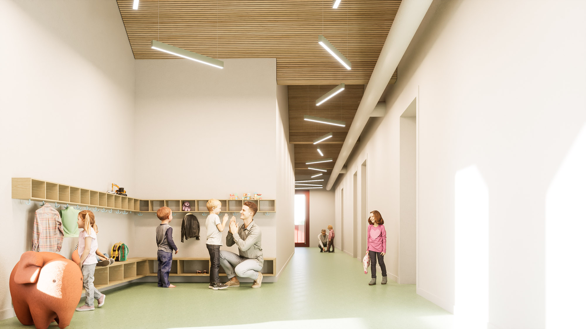 Die KiTa wird insgesamt vier Gruppen für Kinder im Alter zwischen null und sechs Jahren aufnehmen. Neben diesen Clustern bestehend aus Gruppenraum, Intensiv- und Schlafraum, bietet die KiTa einen großzügigen Bewegungsraum sowie Mehrzweckräume für Werken und Musizieren. Das Programm wird abgeschlossen durch alle notwendigen Neben- und Personalräume sowie einer professionellen Küche für die frische Zubereitung der Speisen. Die 3750 m² große Außenspielfläche bietet ausgiebigen Platz zum Spielen und Toben und ermöglicht für jedes Alter ein passendes Bewegungs- und Spielangebot.
