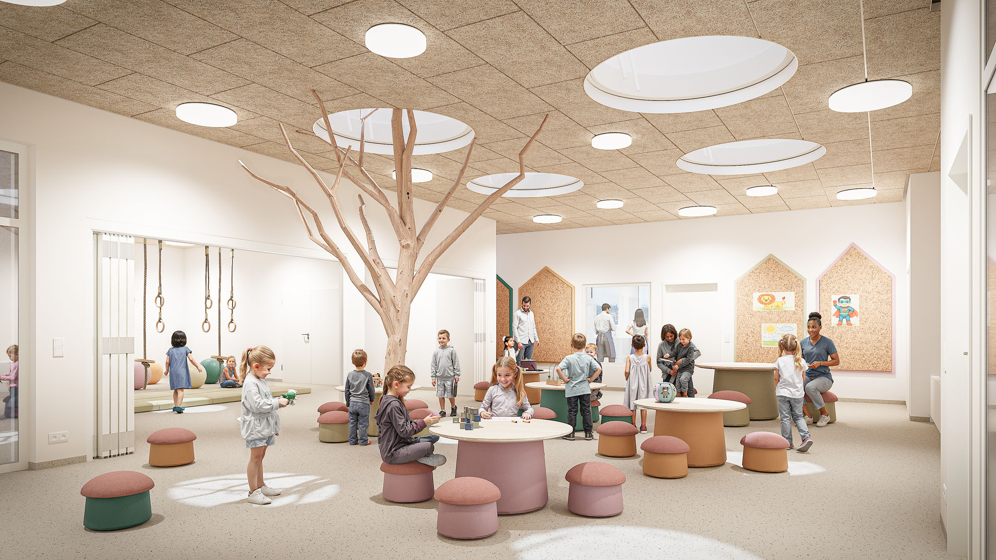 Die Ausstattung ist durchdacht auf die Bedürfnisse der Kinder und der pädagogischen Arbeit abgestimmt – vom Schlafraum über die Spielflure bis hin zum barrierefreien WC.