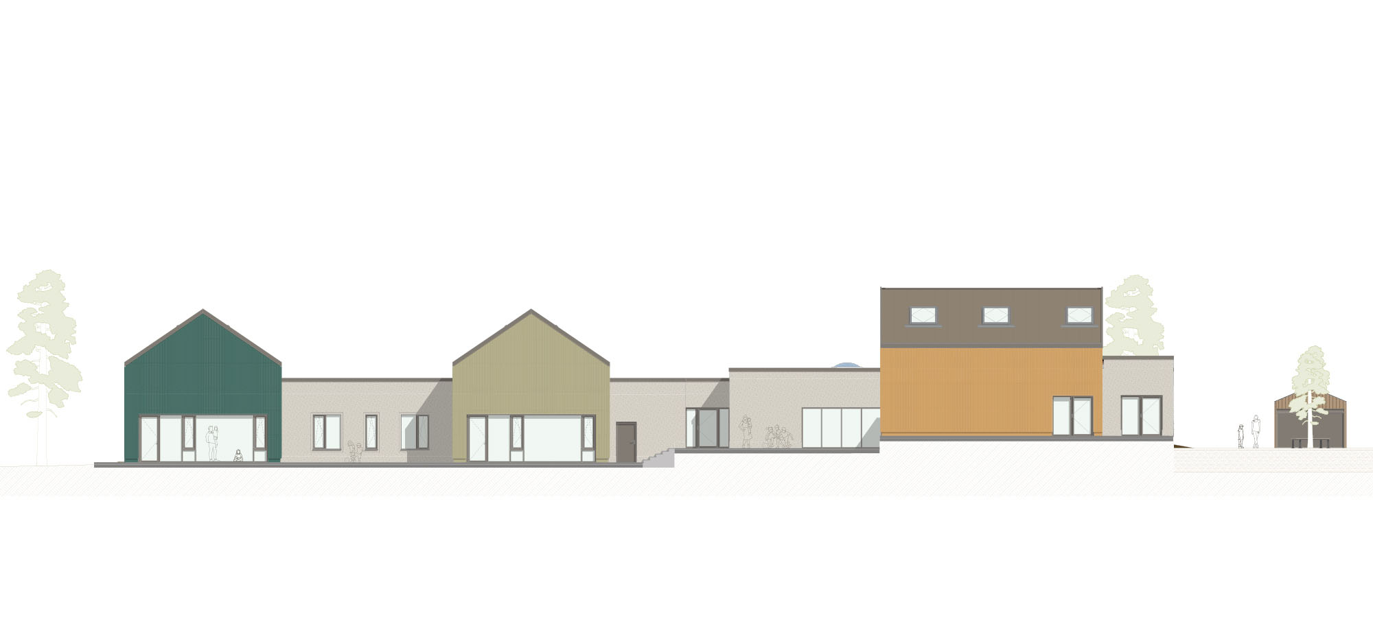 Mit ihrer natürlichen Farb- und Materialwahl fügen sich die differenziert gestalteten Fassaden stimmig in das landschaftliche Umfeld ein. Farbliche Akzente der Satteldachhäuschen heben den dörflichen Charakter der KiTa hervor. Die Gruppenräume öffnen sich mit großzügigen Fenstern hin zum Giebel, während ebenerdige Übergänge zur Terrasse und in den Garten führen. Eine vertikal gegliederte Holzfassade und farbig differenzierte Putzflächen gliedern den Baukörper und betonen die gestaffelte Struktur. Das extensiv begrünte Flachdach und Photovoltaikflächen auf den geneigten Dächern ergänzen das ökologische Konzept.