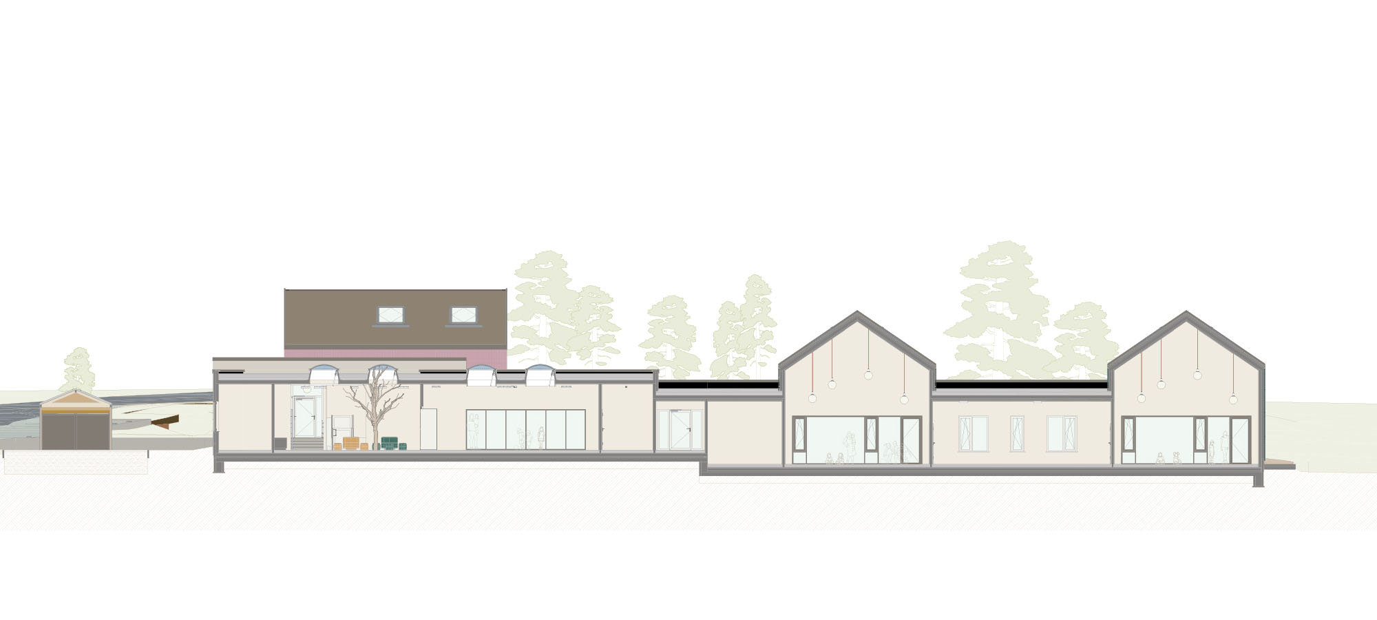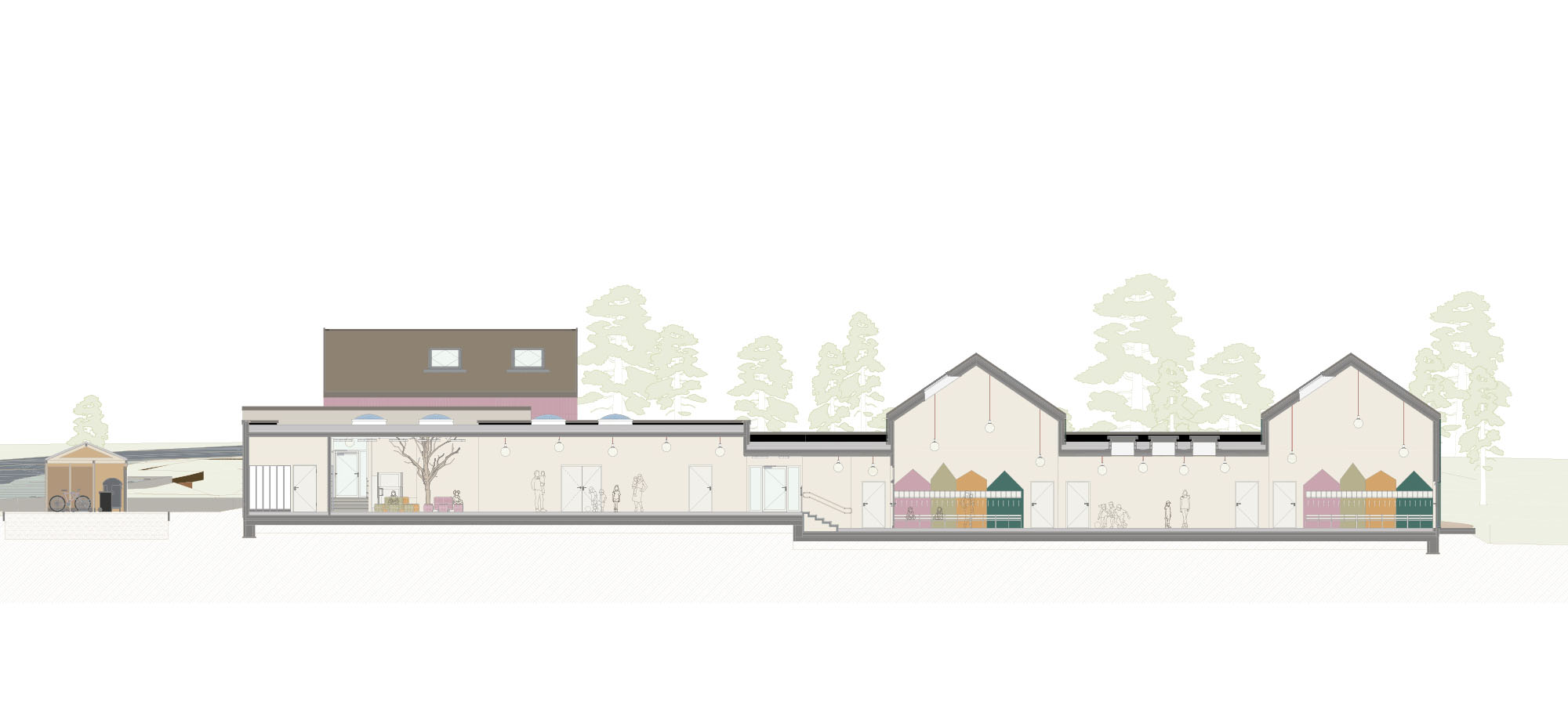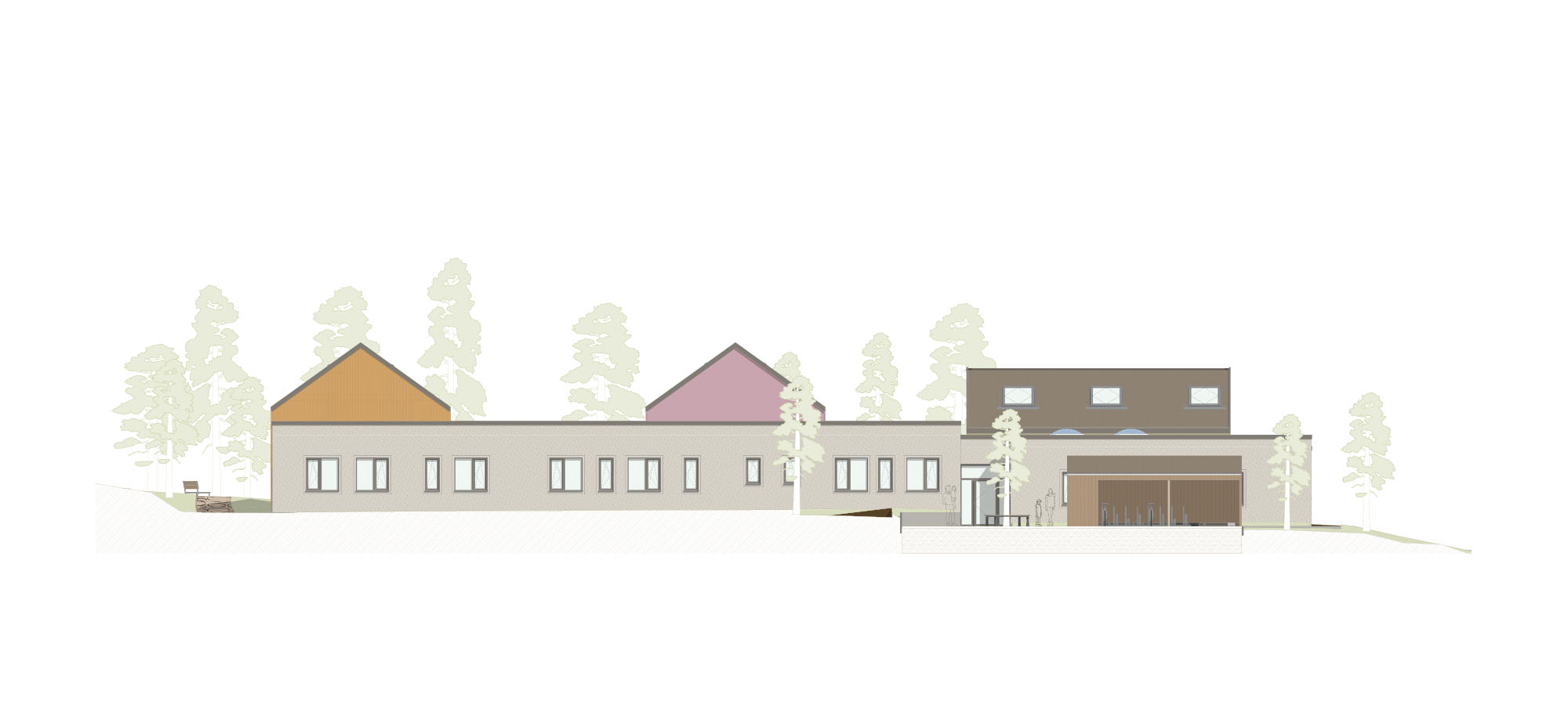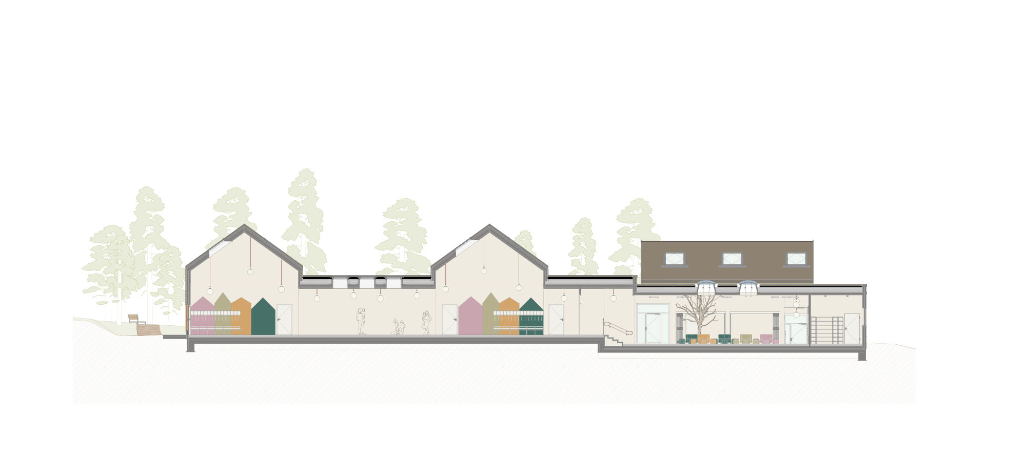 Die Gruppenräume für jeweils zwei U3- und Ü3-Gruppen verteilen sich auf unterschiedlich hohe Gebäudeteile mit charakteristischen Satteldächern. Diese sind nicht nur farblich differenziert, sondern dienen den Kindern auch zur besseren Orientierung. Verbunden werden die Einzelvolumen durch einen eingeschossigen Flachdachbereich, in dem gemeinschaftliche und funktionale Räume wie das Kinder-Café, der Bewegungsraum, die Küche und Personalräume untergebracht sind. Blickachsen durch das Gebäude sorgen für Übersichtlichkeit und Orientierung – und eröffnen immer wieder den direkten Bezug zur Natur.