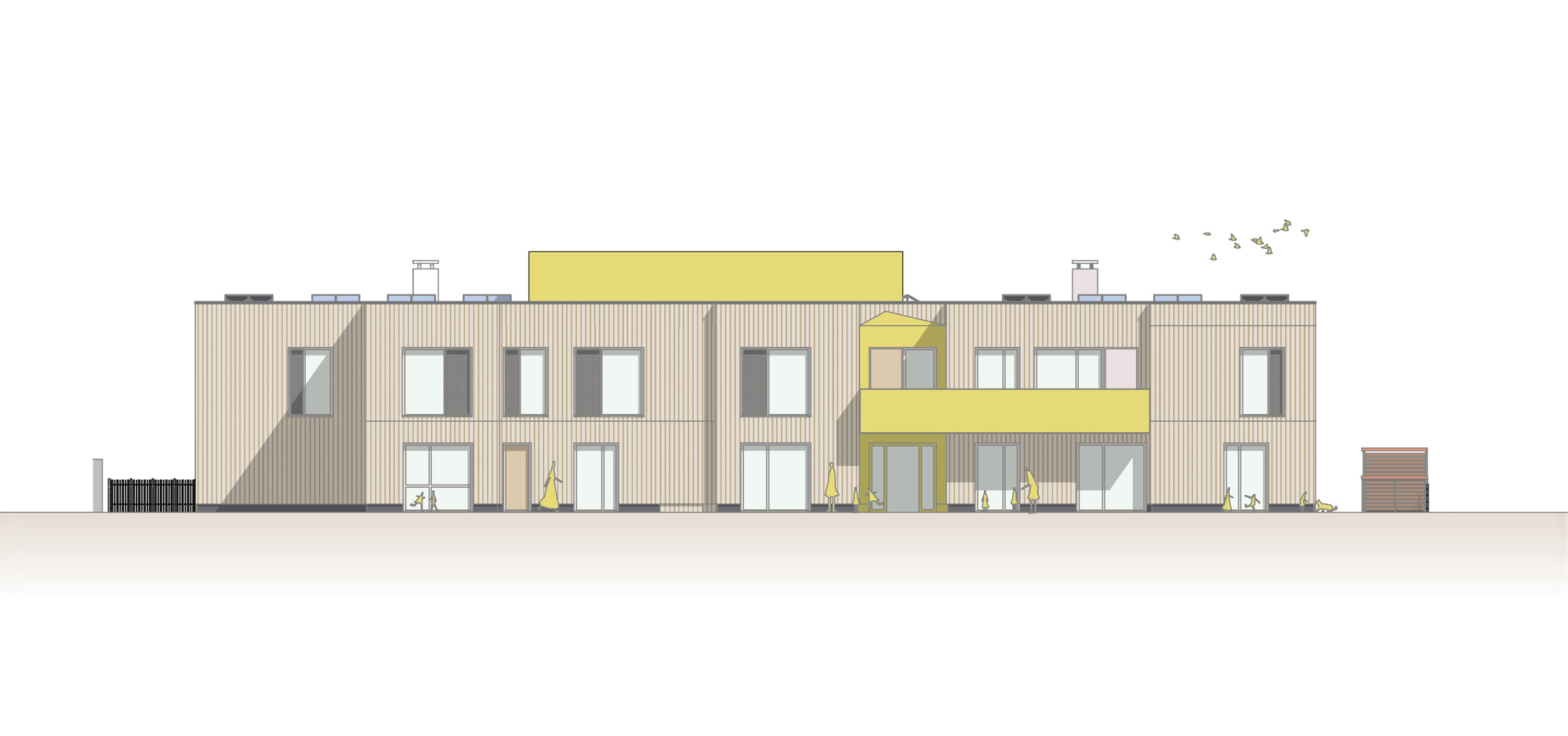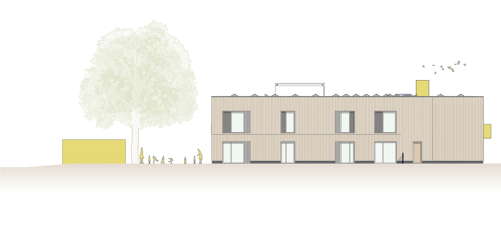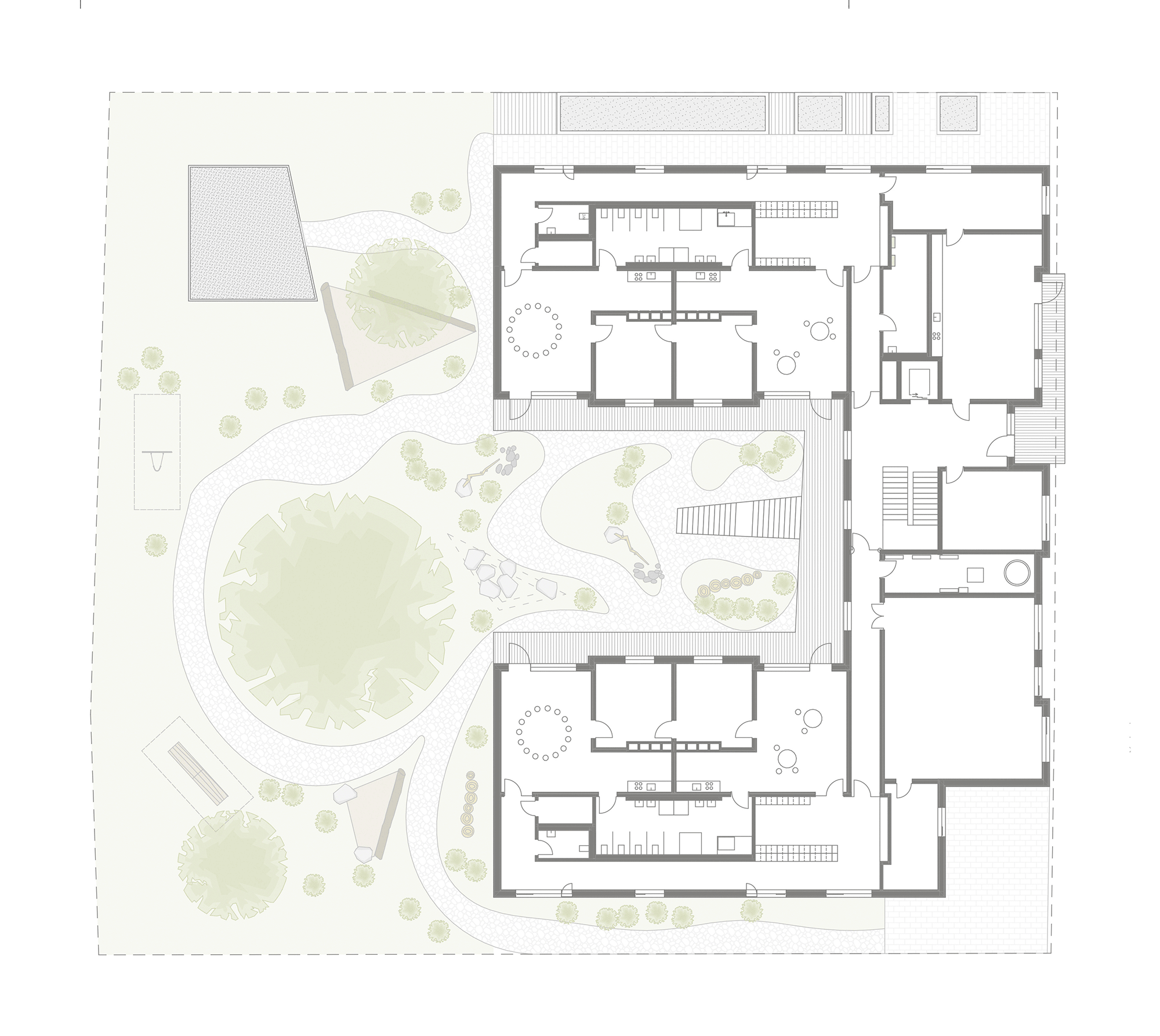 Die KiTa teilt sich in zwei Bereiche auf. Zur Straße gerichtet befinden sich alle administrativen Bereiche wir Personal, Leitung und der Frischküche. Aber auch ein Kinder- und Familienzentrum ist hier untergebracht, das unabhängig vom Kita-Betrieb genutzt werden kann. Die Gruppenräume legen sich entlang der nördlichen Grundstückskante und eröffnet für Kinder und Erziehende den direkten Zugang zum weitläufigen Garten.