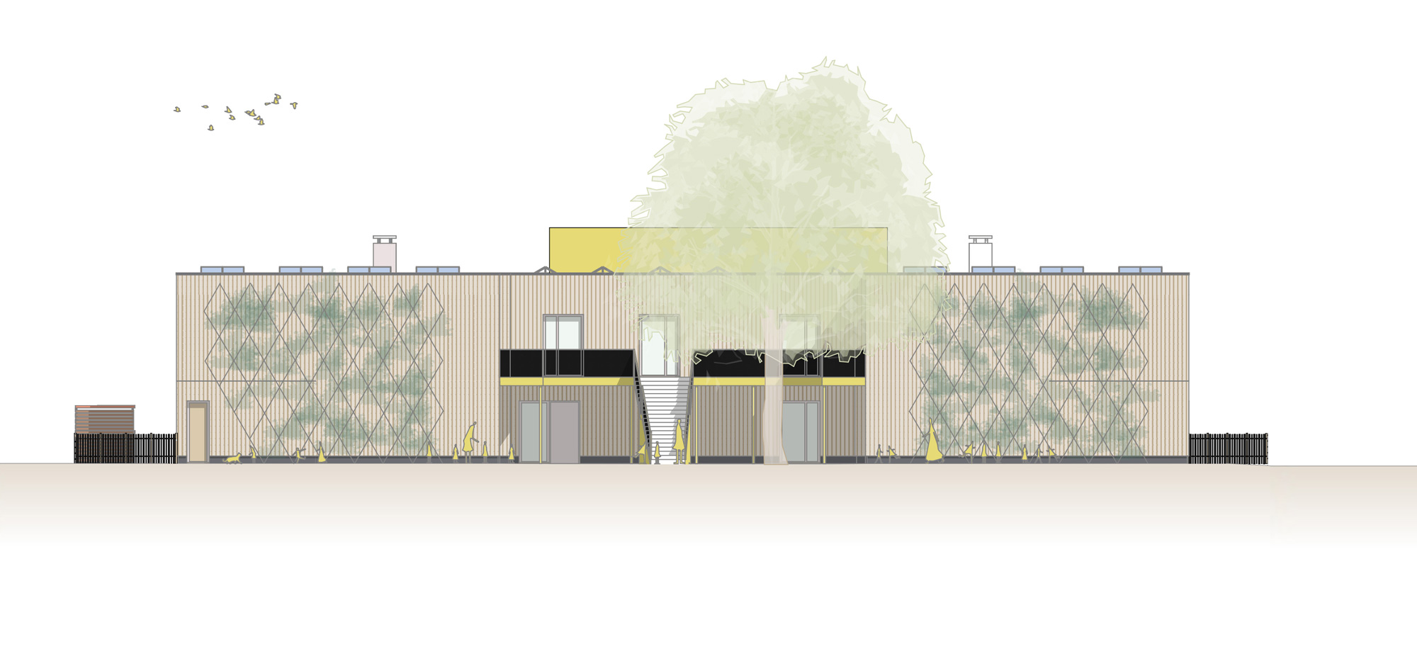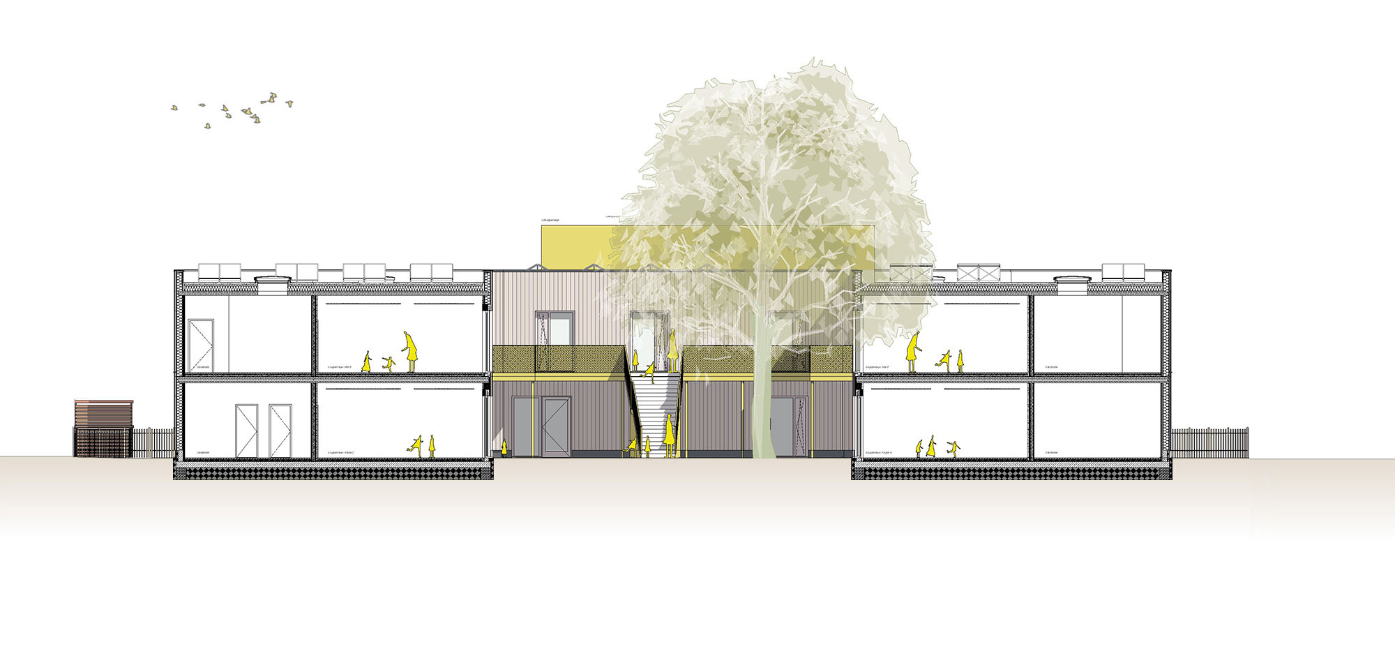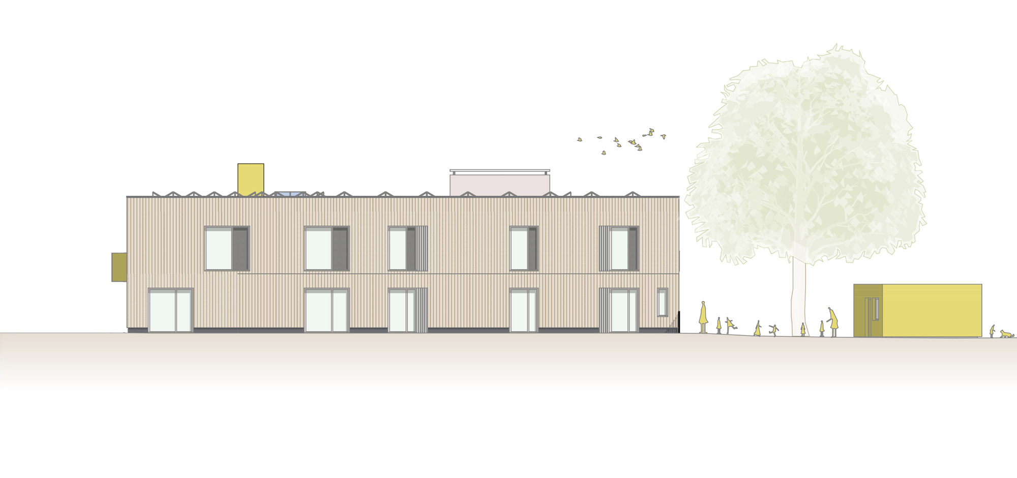 Die KiTa teilt sich in zwei Bereiche auf. Zur Straße gerichtet befinden sich alle administrativen Bereiche wir Personal, Leitung und der Frischküche. Aber auch ein Kinder- und Familienzentrum ist hier untergebracht, das unabhängig vom Kita-Betrieb genutzt werden kann. Die Gruppenräume legen sich entlang der nördlichen Grundstückskante und eröffnet für Kinder und Erziehende den direkten Zugang zum weitläufigen Garten.
