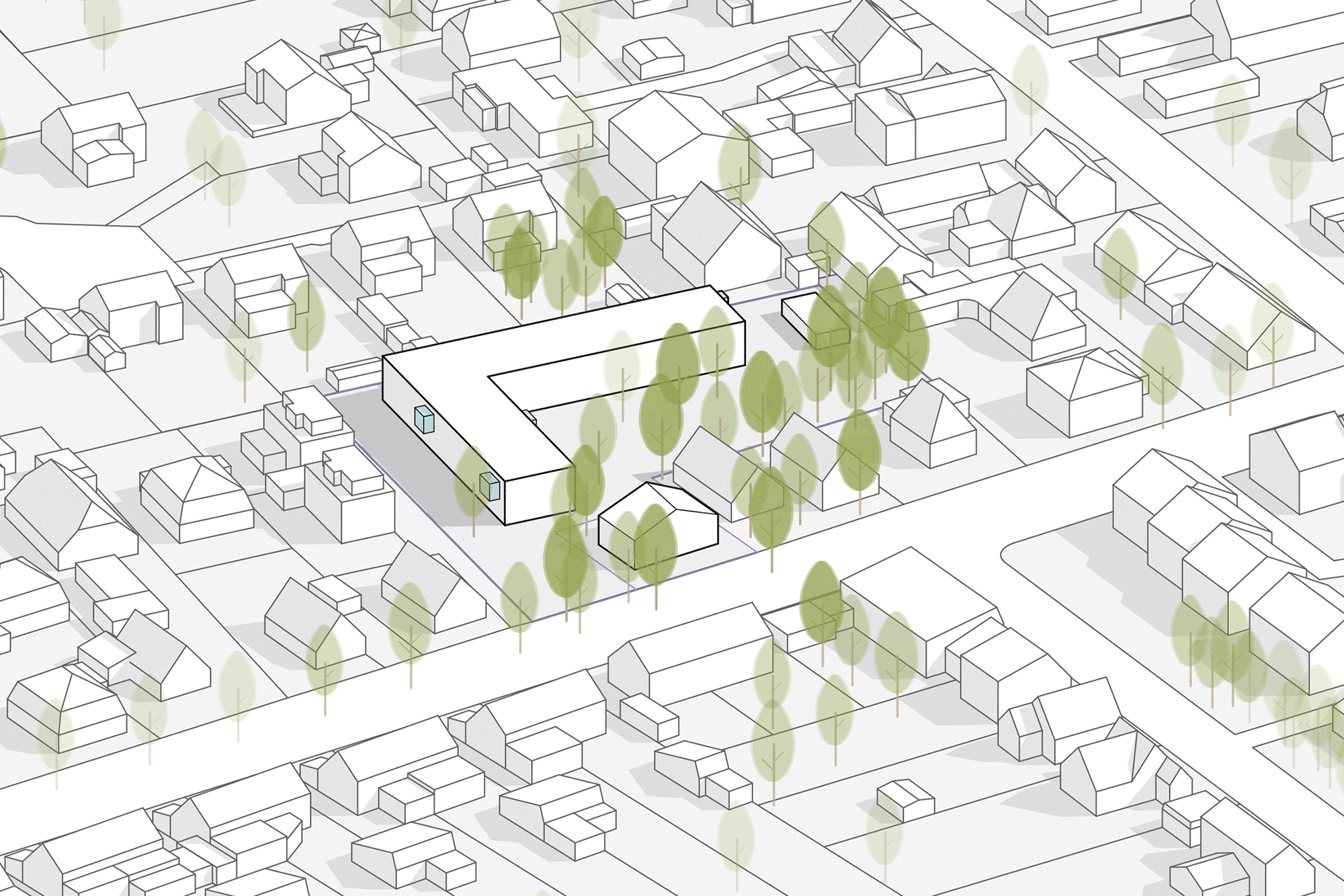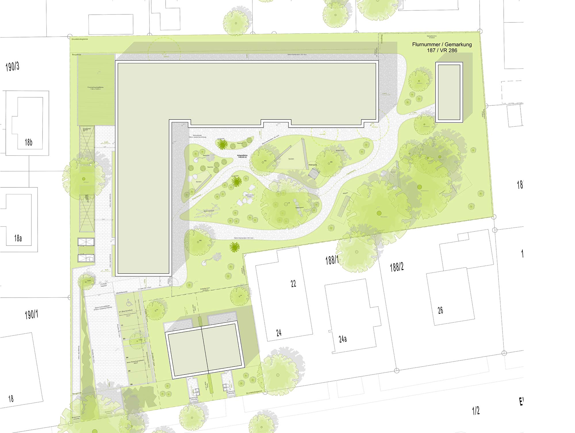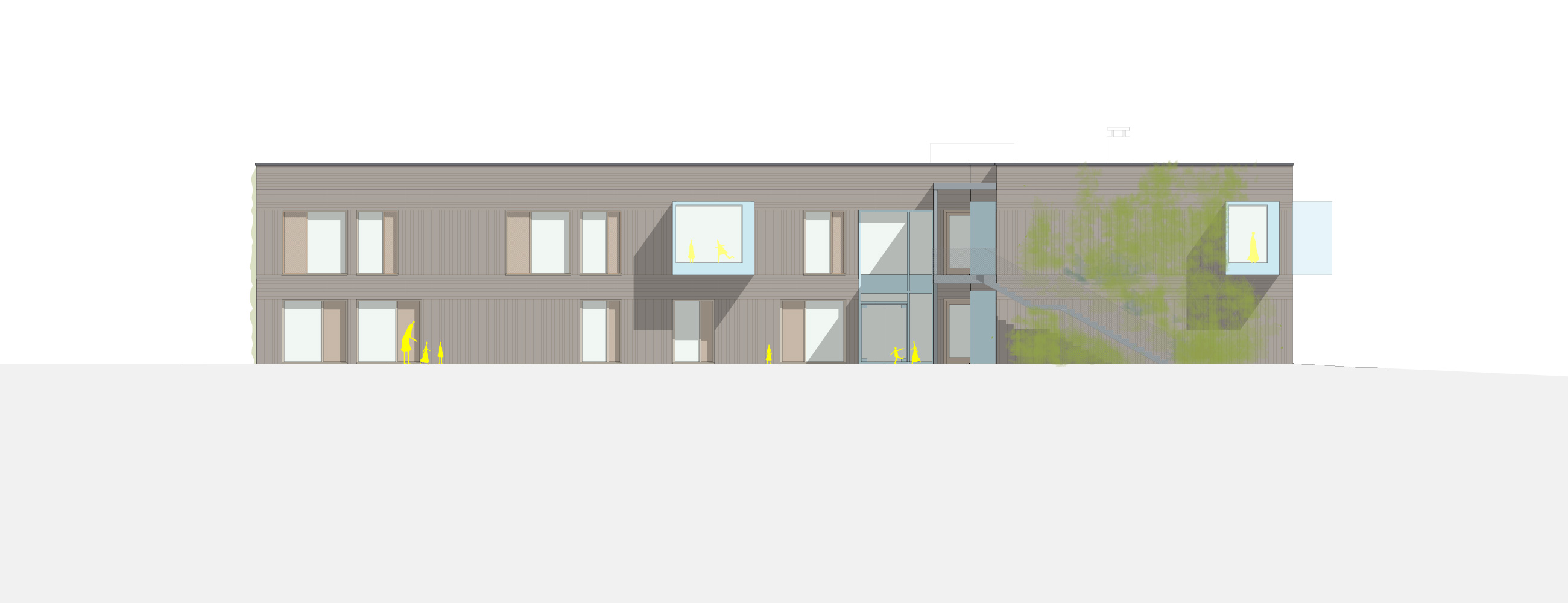 Die KiTa nutzt die vorhandene Geometrie des Grundstücks und rück von der Straße ab. Zum eigenen Erschließungsweg gerichtet, befinden sich alle administrativen Bereiche wie Personal, Leitung und der Frischküche. Aber auch ein Kinder- und Familienzentrum ist hier untergebracht, das unabhängig vom KiTa-Betrieb genutzt werden kann. Die Gruppenräume legen sich entlang der nördlichen Grundstückskante und eröffnet für Kinder und Erziehende den direkten Zugang zum weitläufigen Garten.
