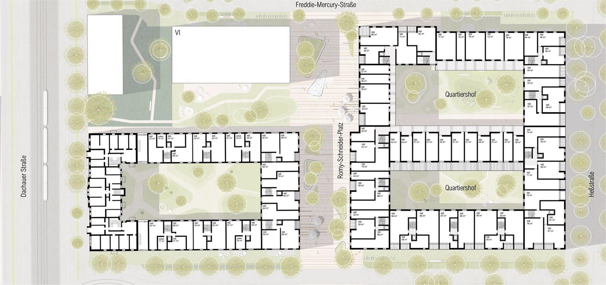 Die beiden Gebäude des MU3 und MU4 bilden eine Nachbarschaft. Das größere (MU3) umschließt zwei Innenhöfe. Jener mit Spielplatz ist der KITA im nördlichen Teil zugeordnet. Der südliche Hof soll den zukünftigen Mieter:innen der Wohnungen einen Rückzugsort bieten, aber auch zu gemeinsamen Aktivitäten einladen.